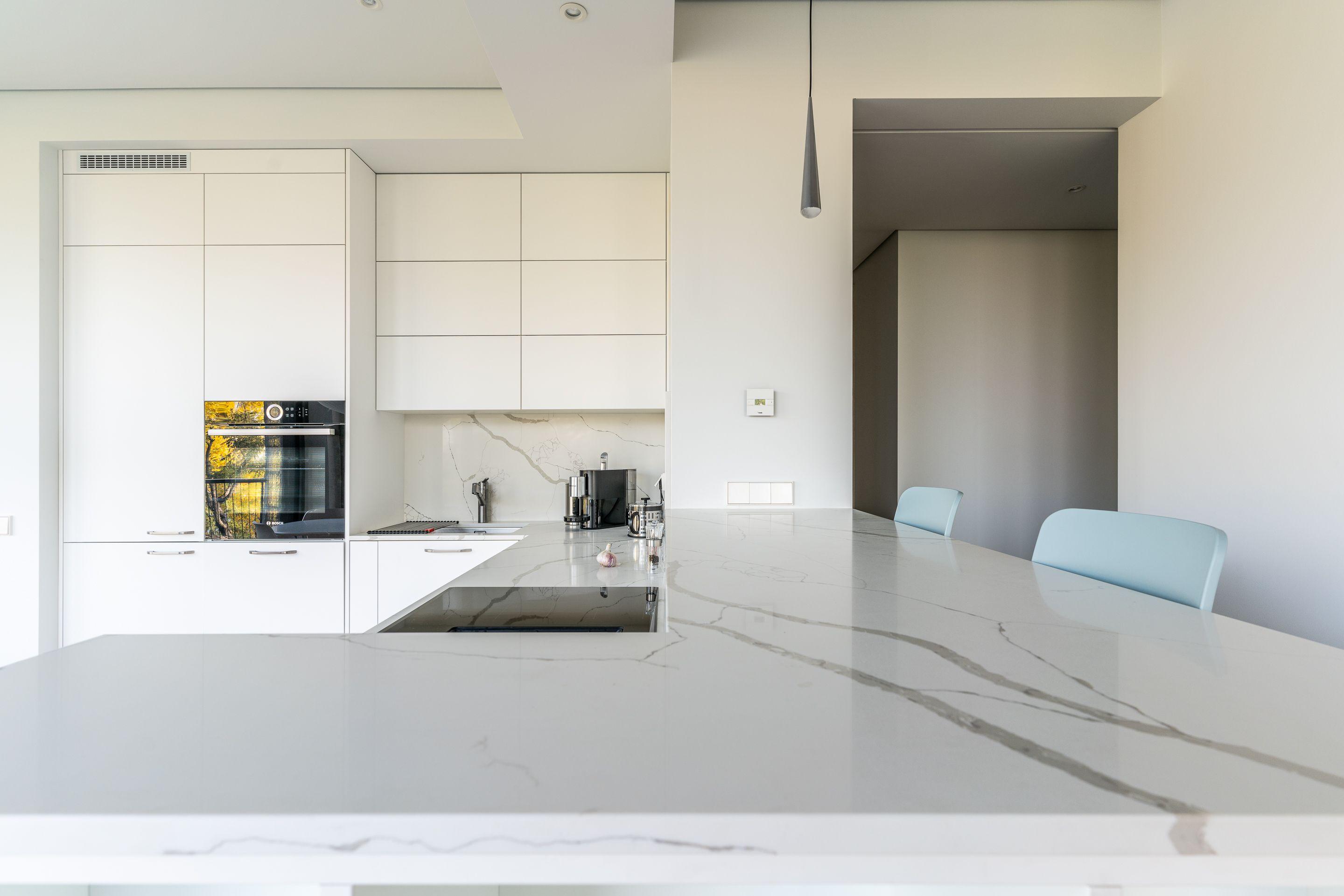 Galerija: bildes no virtuves dzīvoklim pārdaugavā ar Calcatta kvarca akmens darba virsmu