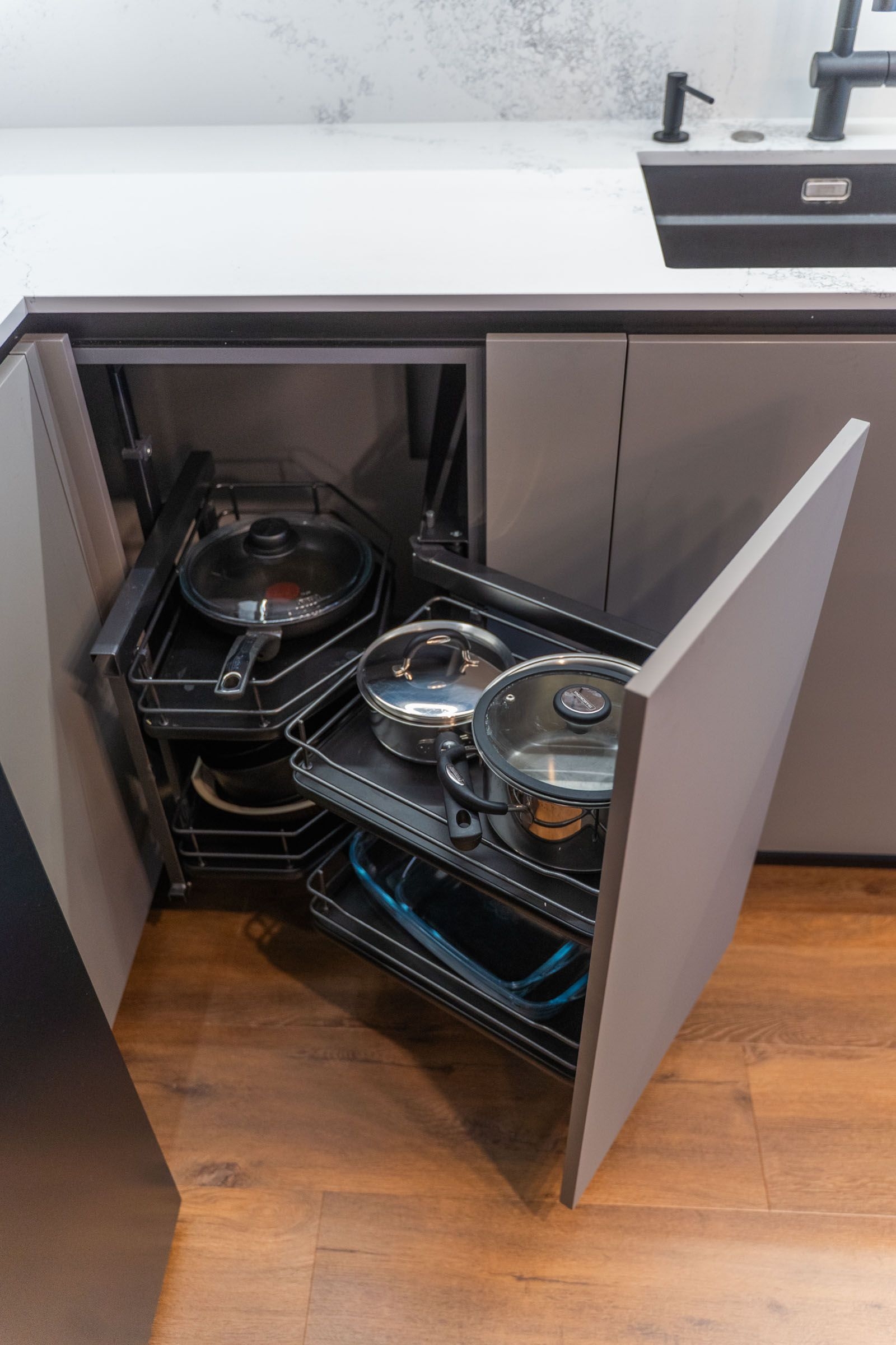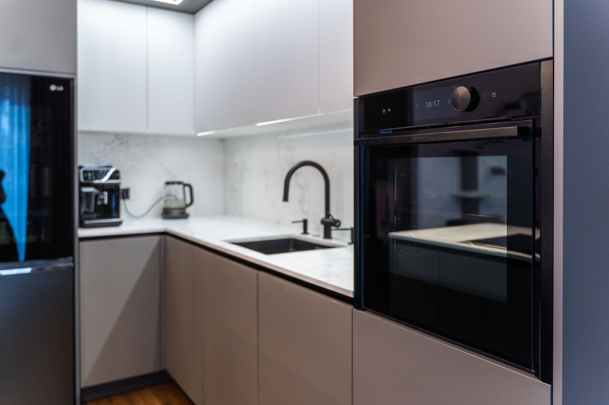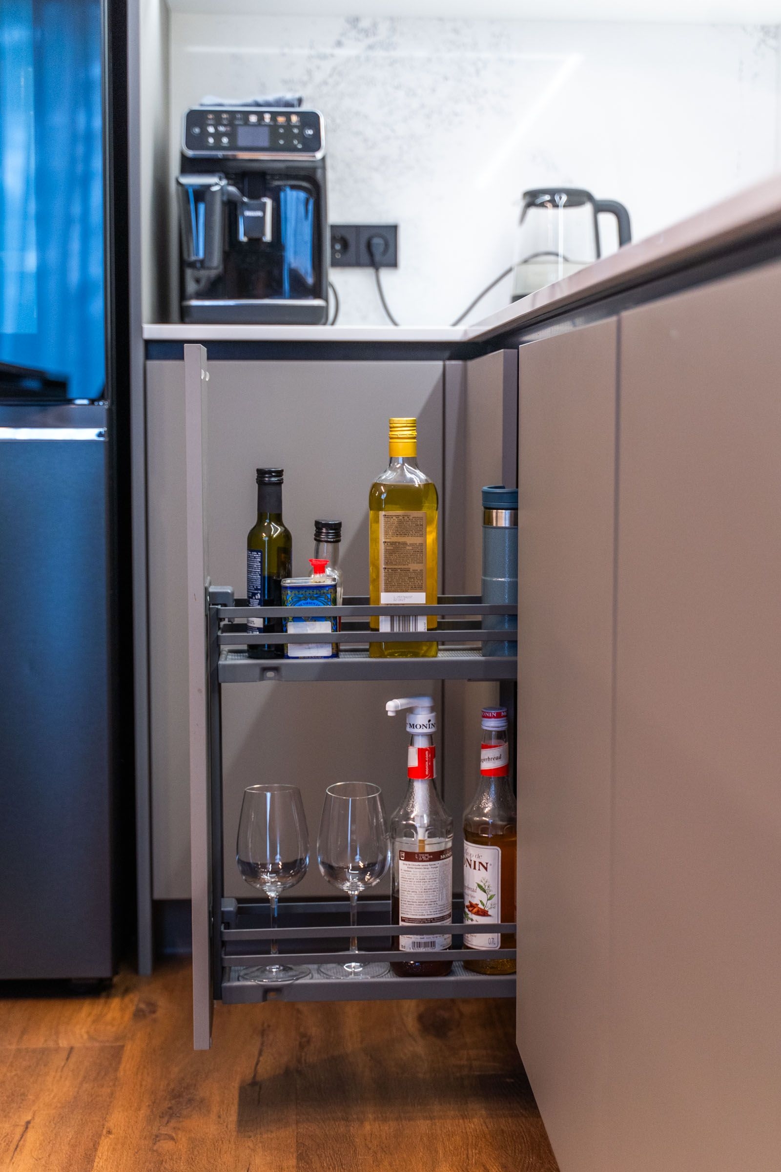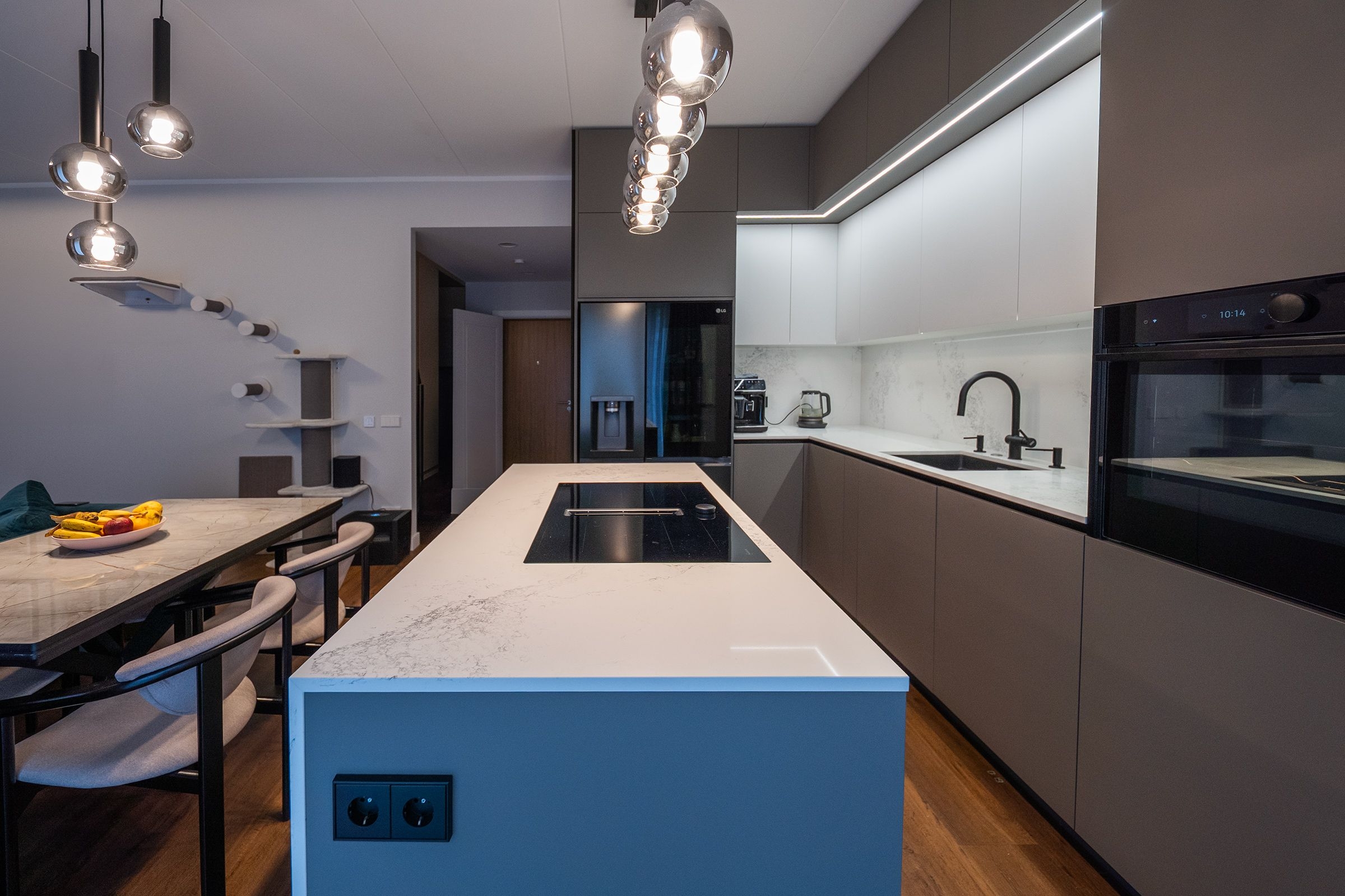Virtuves mēbeles ar salu, kas izgatavotas Bonava projektā “Čiekuru mājas.” Virtuves fasādes veidotas no REHAU akrila, kas izceļas ar ideāli matētu virsmu un izteiksmīgu, mūsdienīgu estētiku. Kvarca akmens darba virsma un sienas panelis veido vienotu, vizuāli tīru kompozīciju, vienlaikus nodrošinot augstu izturību un praktiskumu ikdienas lietošanā. BLUM furnitūra un dažādas grozu sistēmas palīdz maksimāli efektīvi izmantot telpu un ērti piekļūt pat vistālākajam stūrim. Neff sadzīves tehnika nodrošina augstākās klases funkcionalitāti un komfortu, organiski iekļaujoties kopējā dizaina koncepcijā. #olivemebeles #bonava #ciekurumajas #rehau #neff #kvarcaakmens
