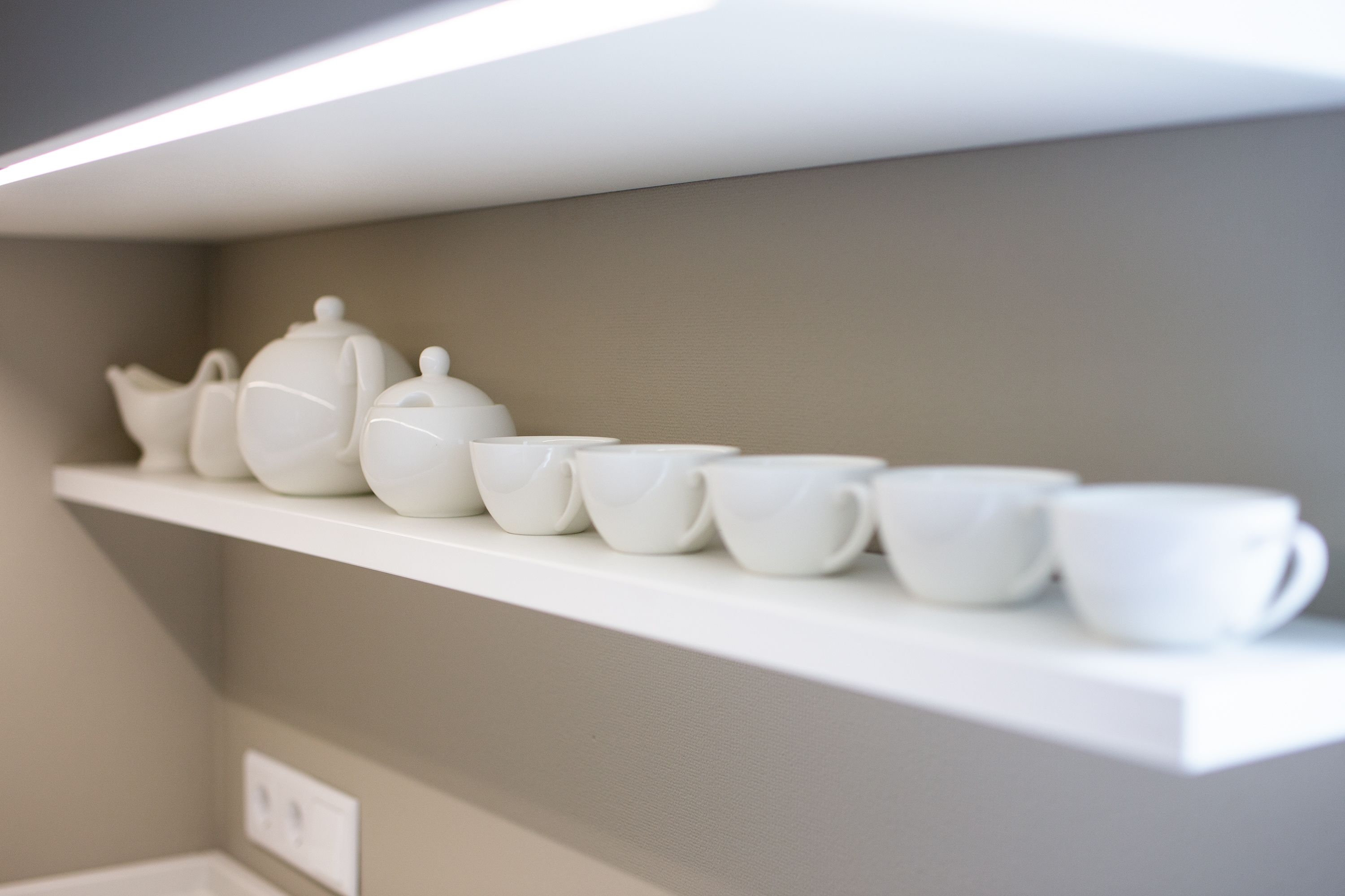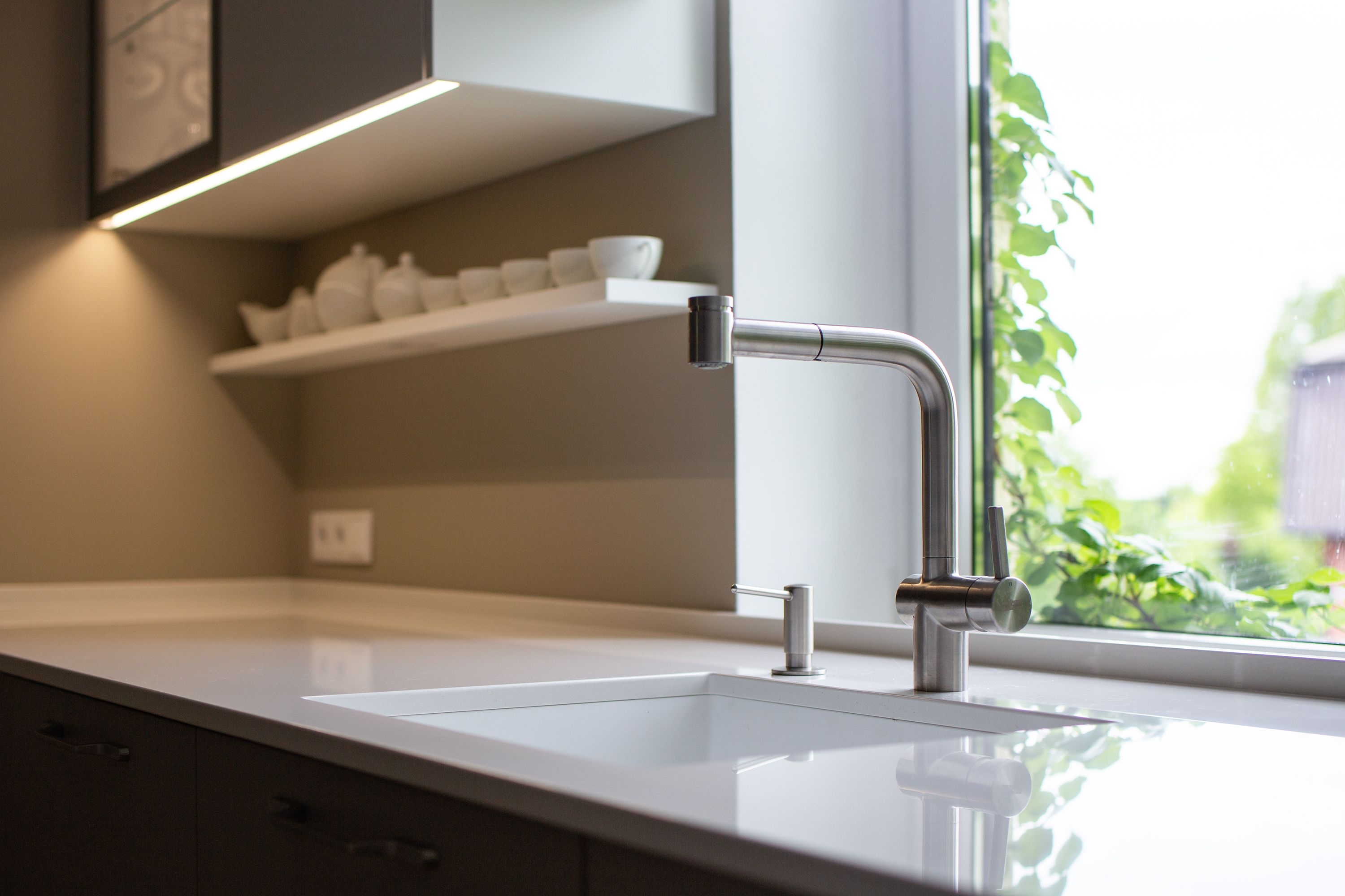 Virtuves iekārta privātmājā Ķekavā. Fasēdes - REHAU matēts akrils + alumīnija rāmju stiklotas fasādes; Darba virsma - kvarca akmens; BLUM furnitūra, Lemans stūra sistēma no Kessebohmer, LED darba virsmas apgaismojums, lete no HPL, pabūvējamā izlietne Eleci.