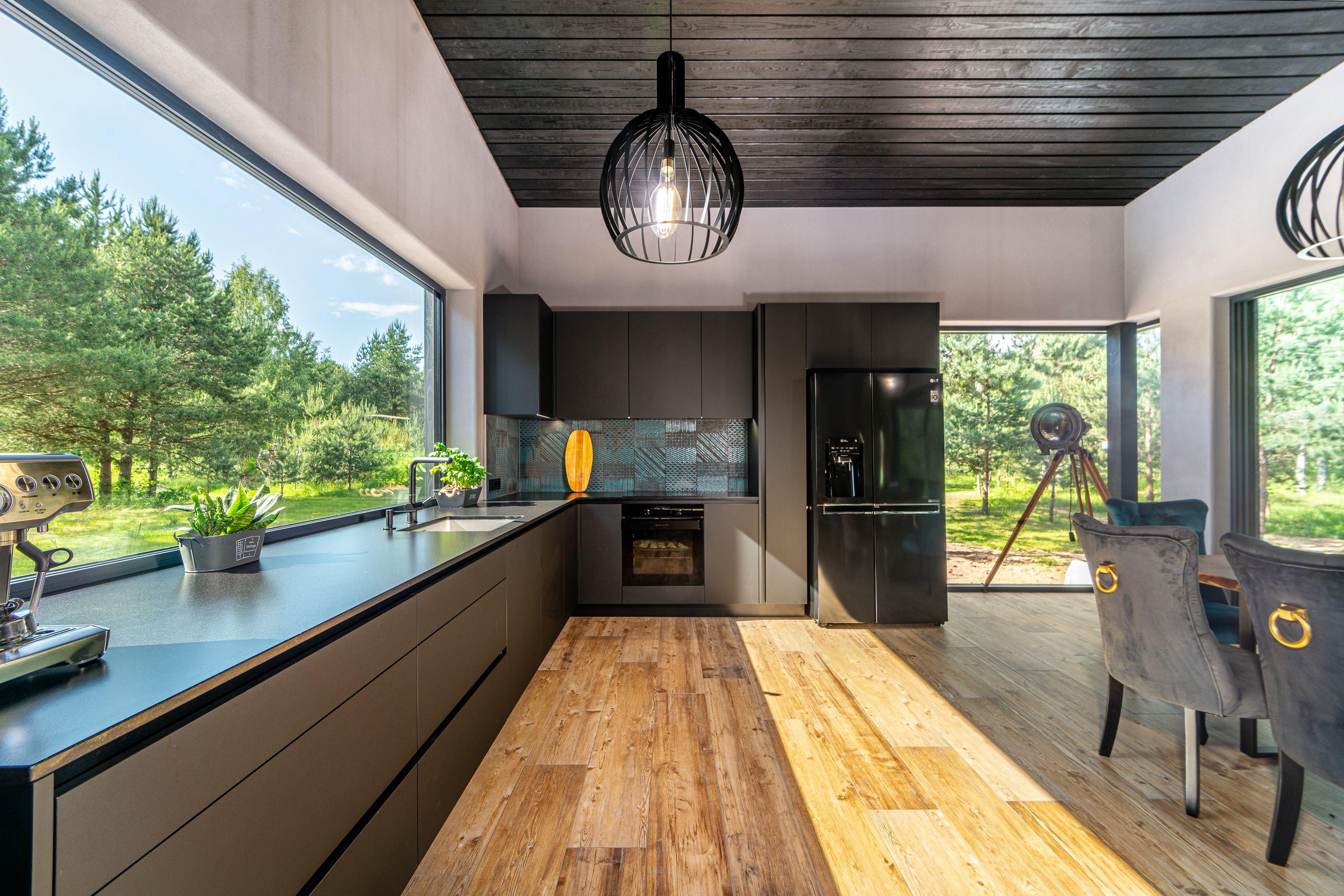 Virtuves iekārta privatāmājai Ādažos. Fasādes - melns FENIX plastikāts Darba virsma - Stone Italiana melns matēts kvarca akmens ar Franke pabūvējamo izlietni Atvilktņu mehānismi - BLUM Antaro Orion Atveršana - melns iefrēzēts profilrokturis