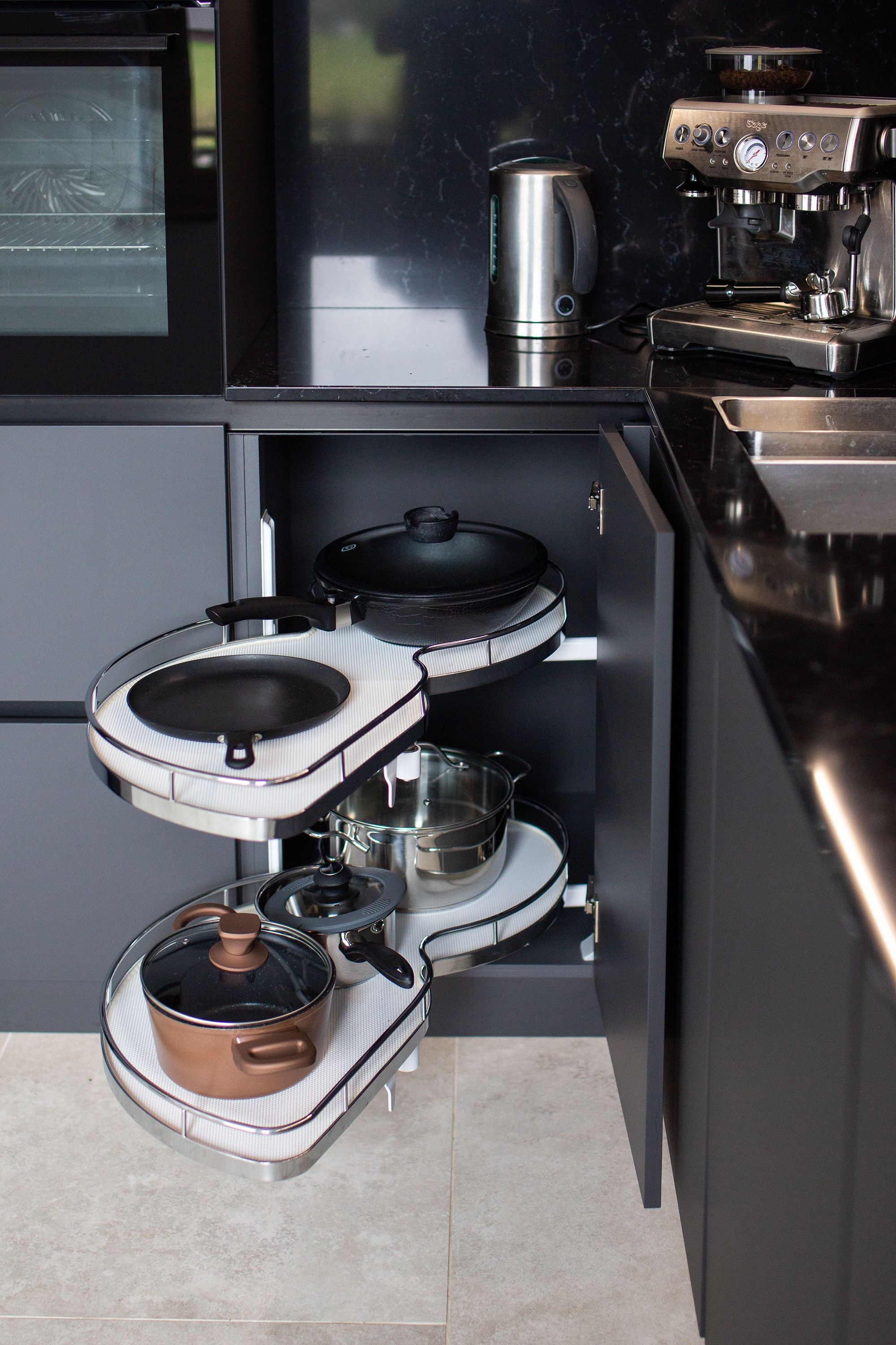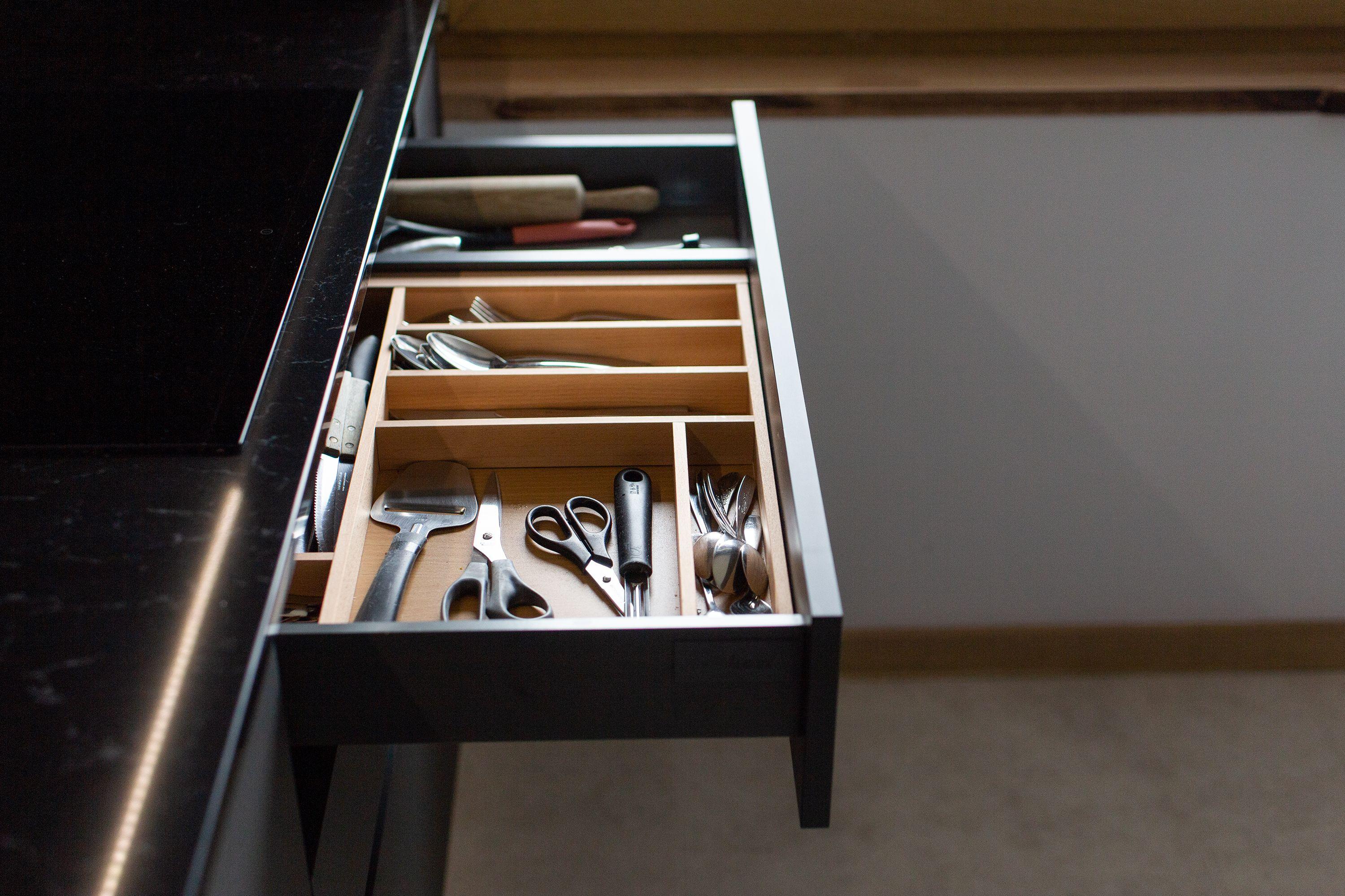 Klientiem svarīgs faktors bija materiālu viegla kopšana un izturība pret mehānisko iedarbību. Sienas skapīšiem bija jābūt ērti lietojamiem, ar ko lieliski tiek galā Blum Aventos mehānismi ar elektrisko Servo pacelšanu.