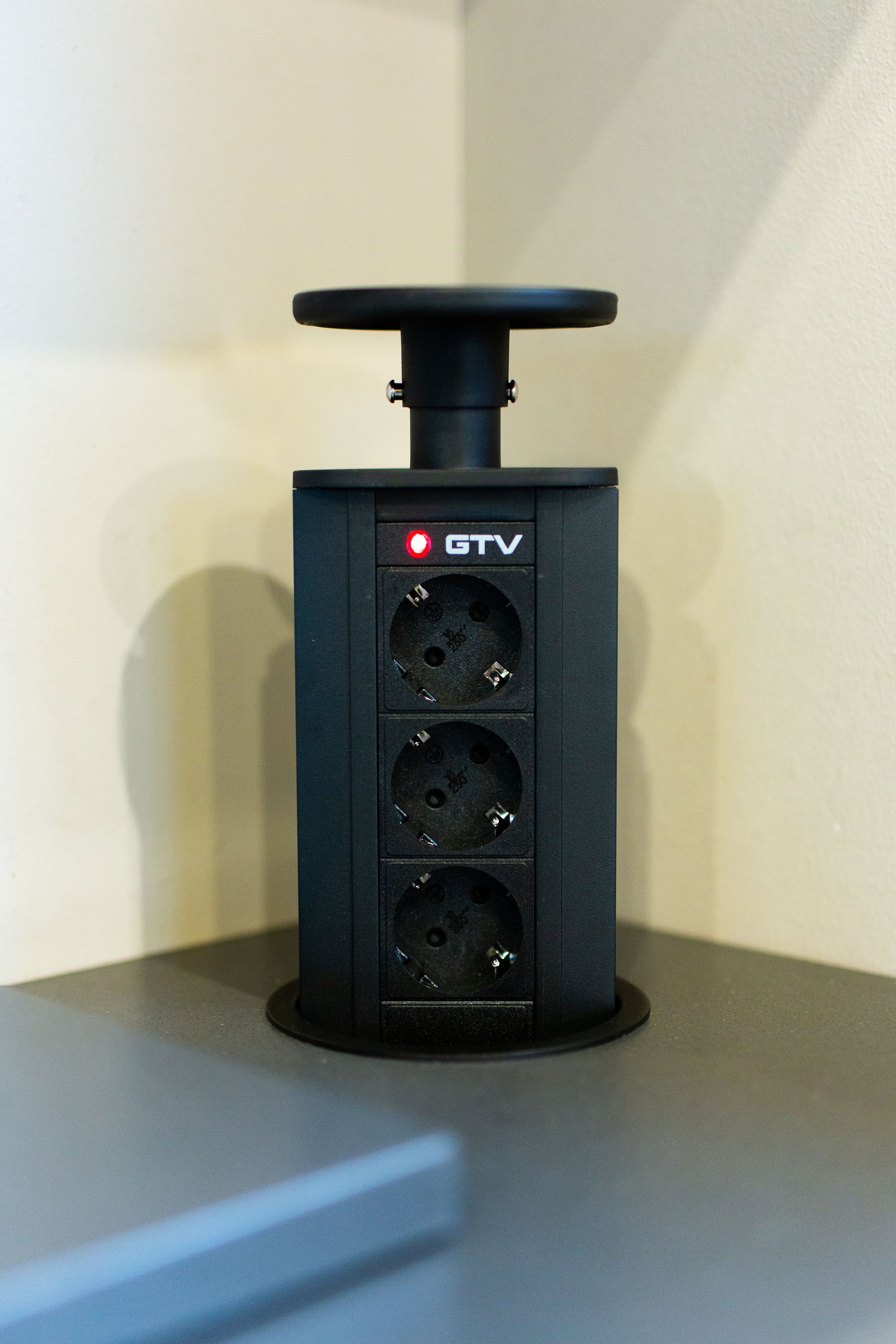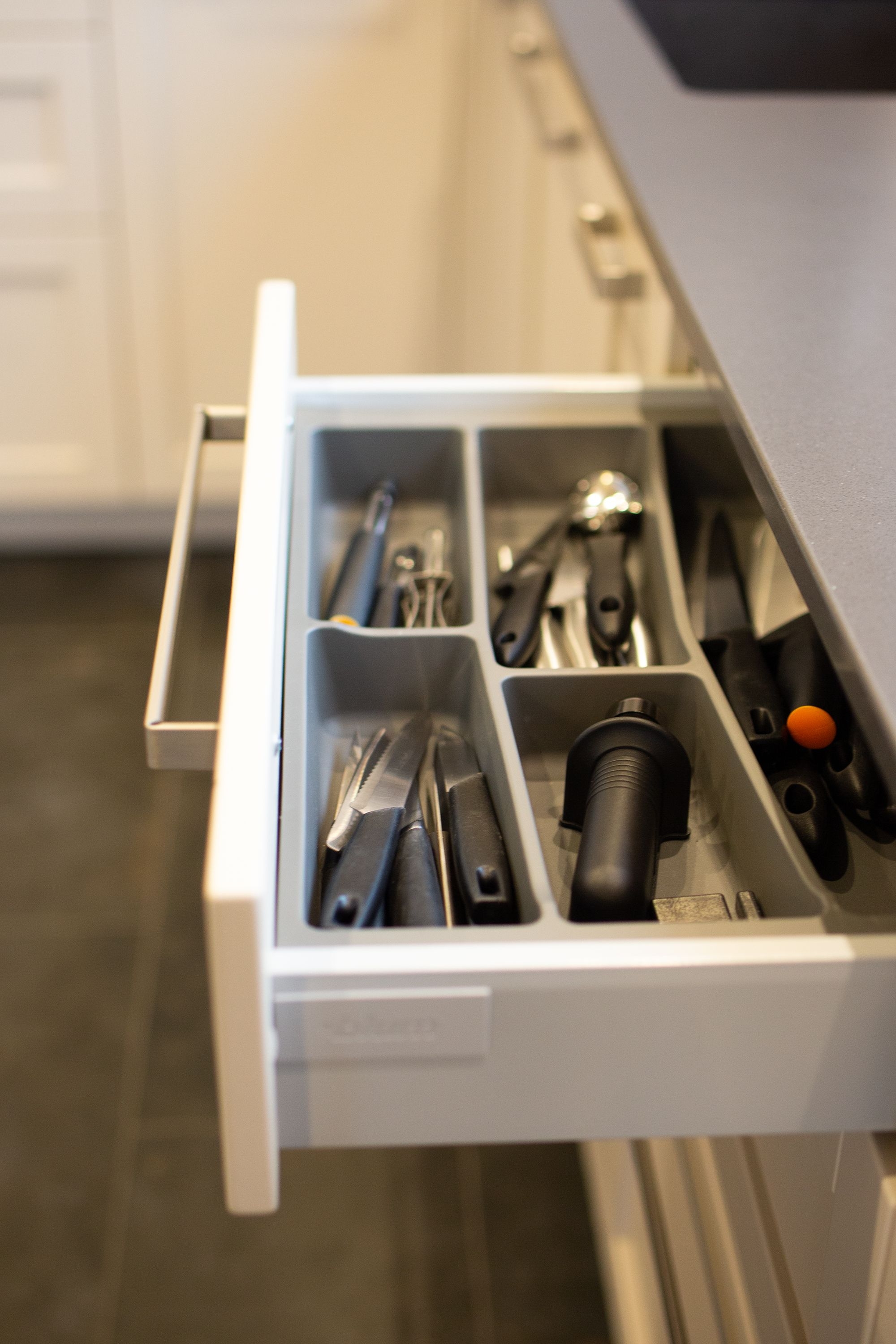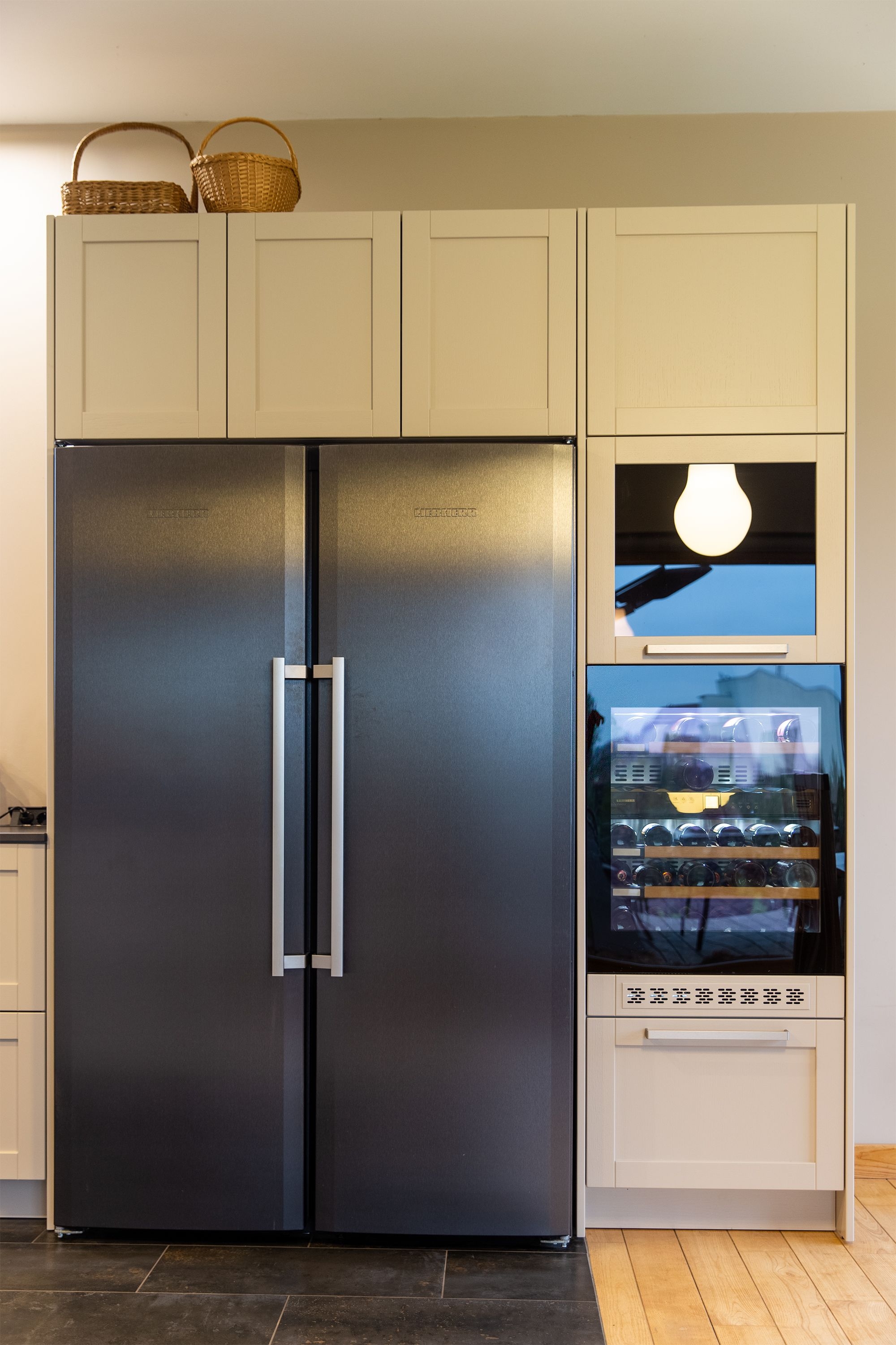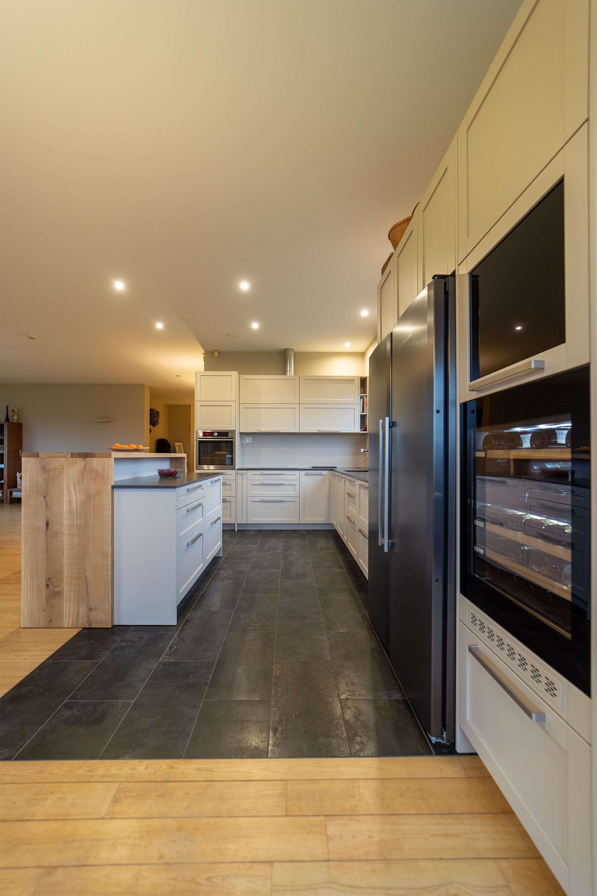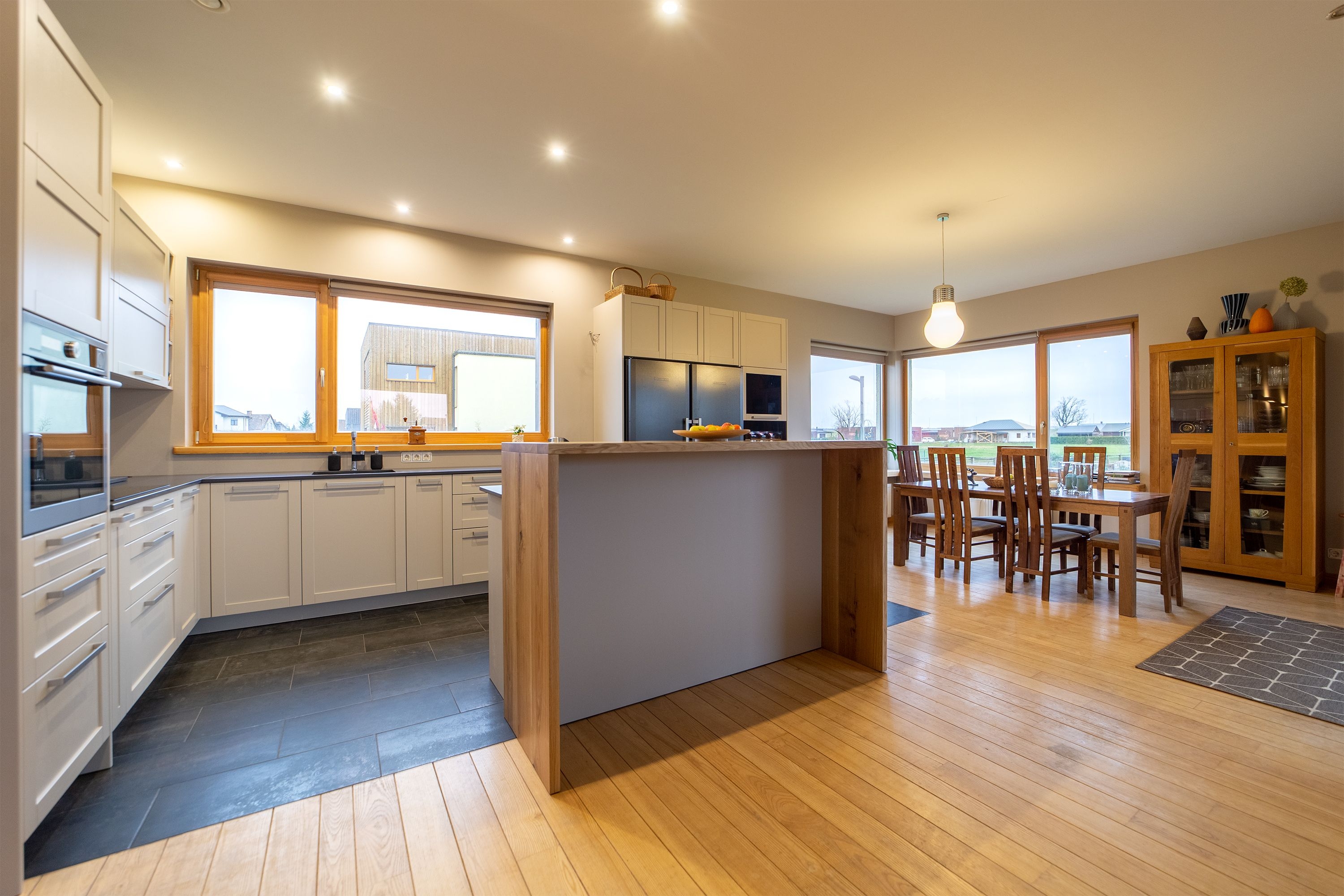 Virtuves iekārta ar krāsotam rāmju fasādēm un kvarca akmens darba virsmu. Ozola masīvkoka lete, rokturi Furnipart, LED darba virsmas apgaismojums, Franke pabūvējamā izlietne un ūdens maisītājs.
