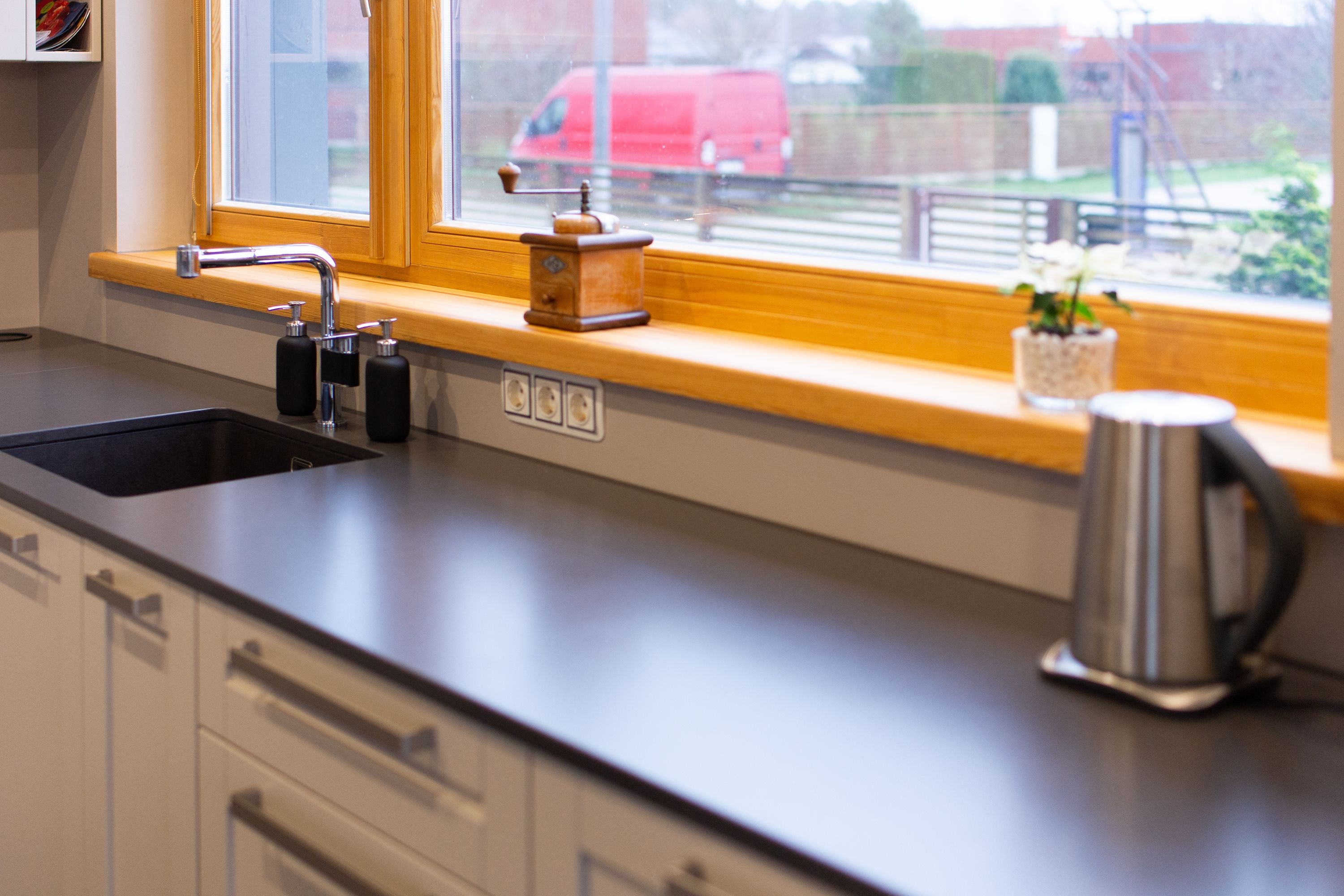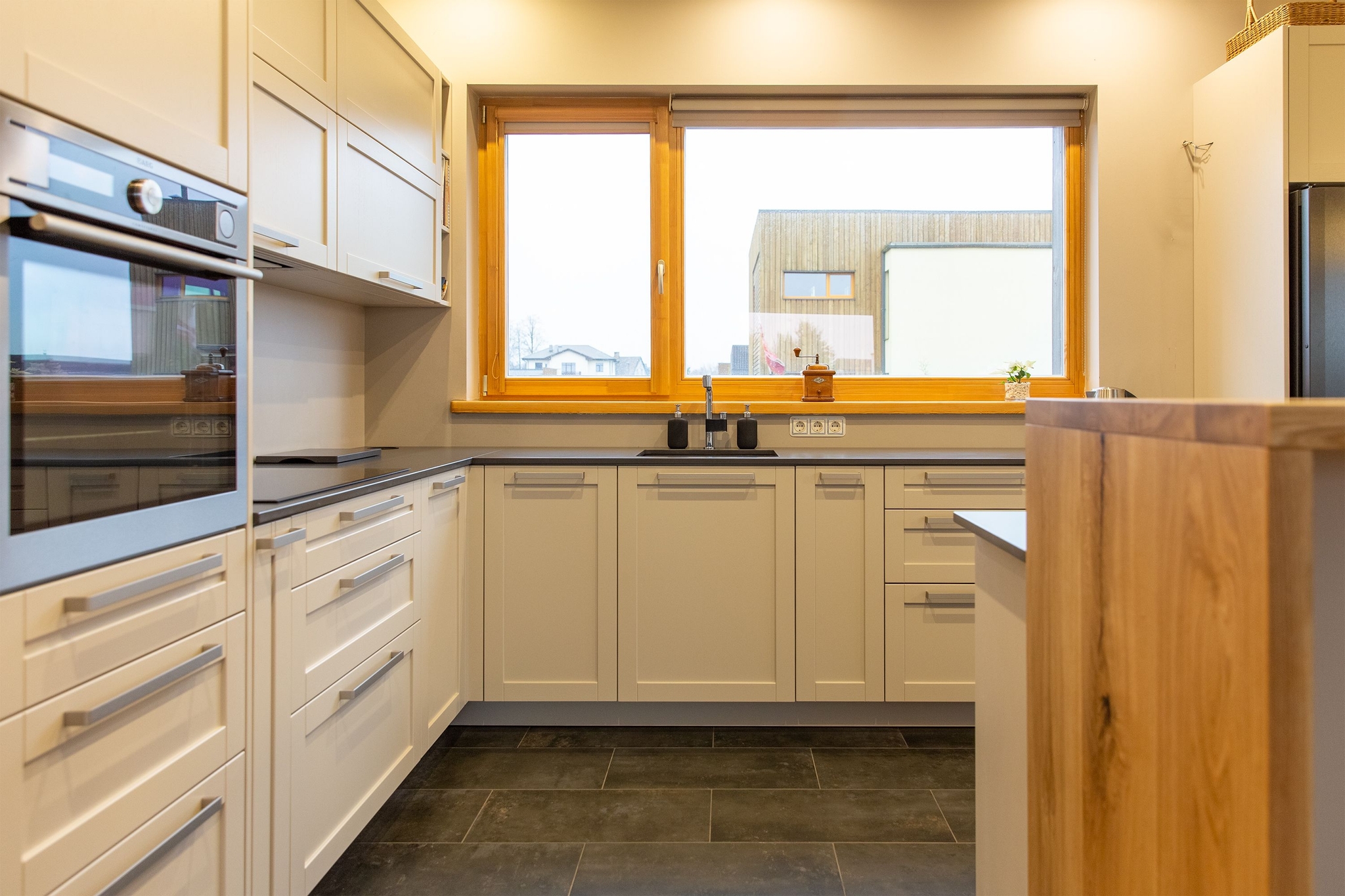 Virtuve ar rāmju fasādēm un kvarca akmens virsmu