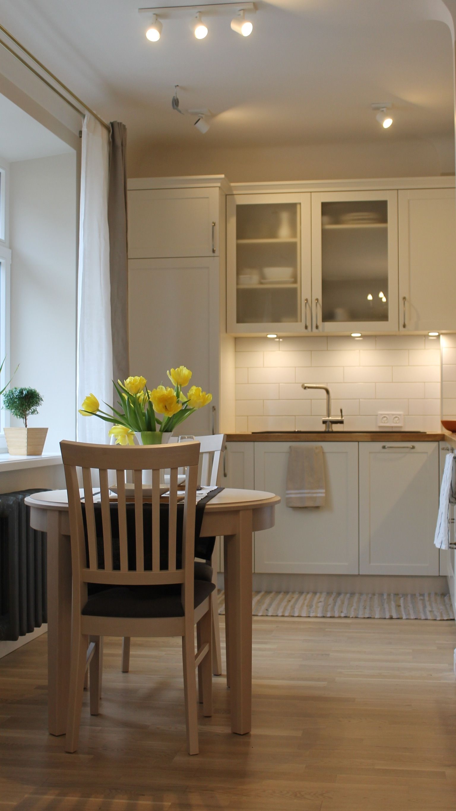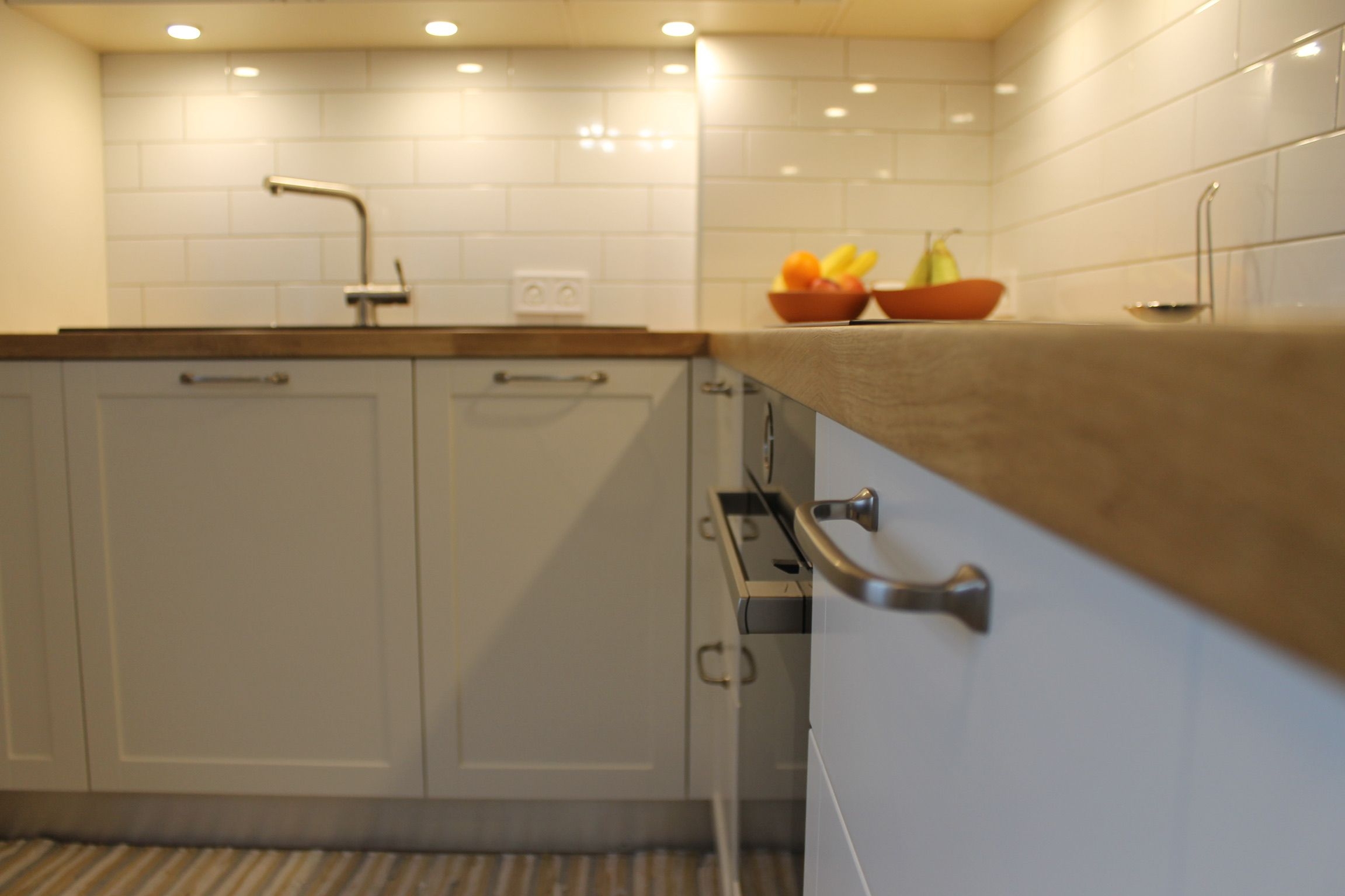 Virtuve ar rāmju krāsotām fasādēm un ozola masīvkoka darba virsmu. BLUM Antaro atvilktņu furnitūra, rokturi Furnipart, Franke Garbo atkritumu šķirošanas sistēma, LED virsmas apgaismojums. Pie virtuves tika izgatavots galdiņs ar krāsotā ozola kājām un masīvkoka eļļotu virsmu.