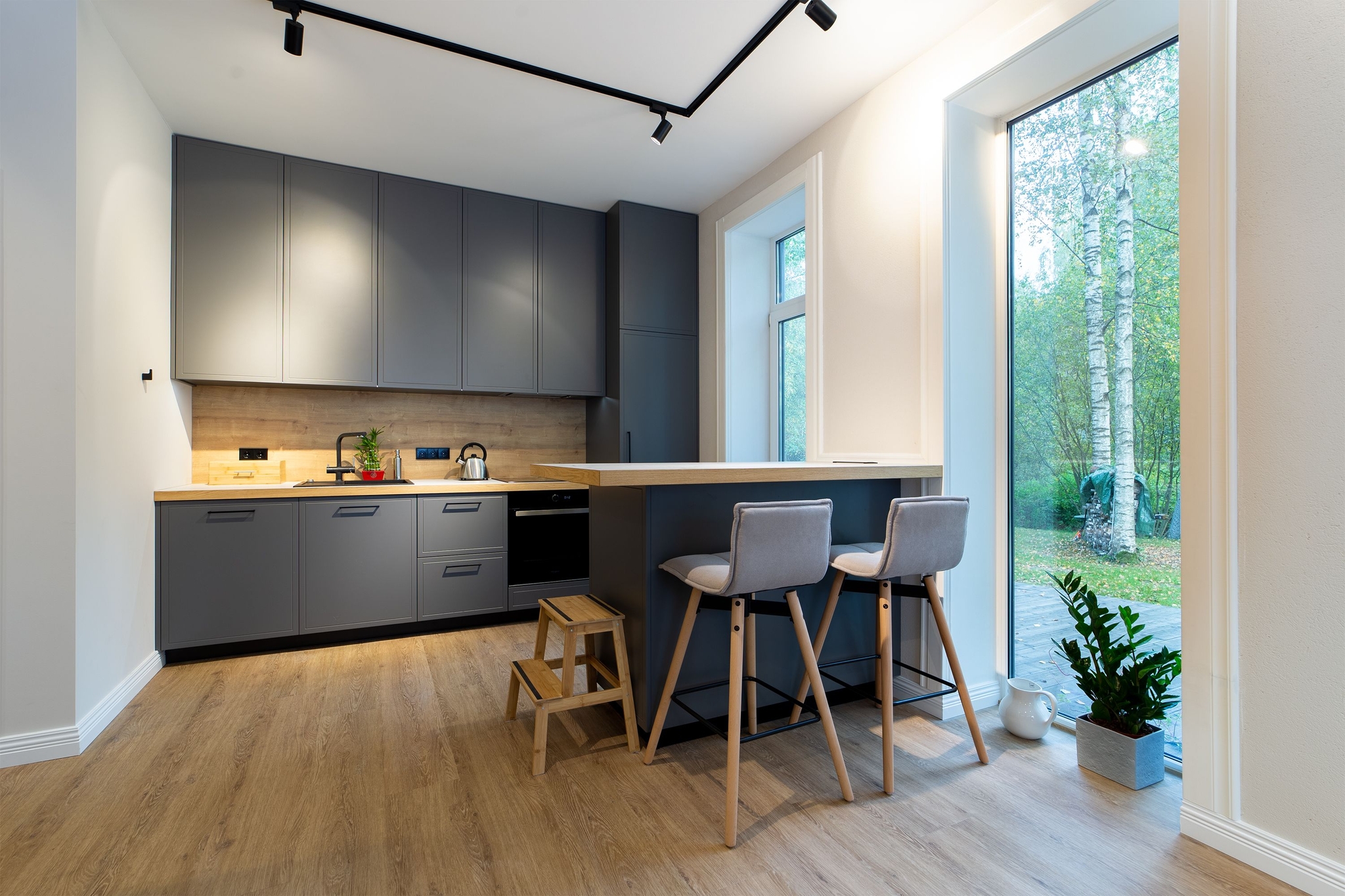 Virtuve privātmājai Rīgā ar krāsota MDF fasādēm, darba virsma - HPL plastikāts ar dabīga ozola malām, sienas panelis - Egger HPL. BLUM Atnaro Orion atvilktņu furnitūra, rokturi - Furnipart.