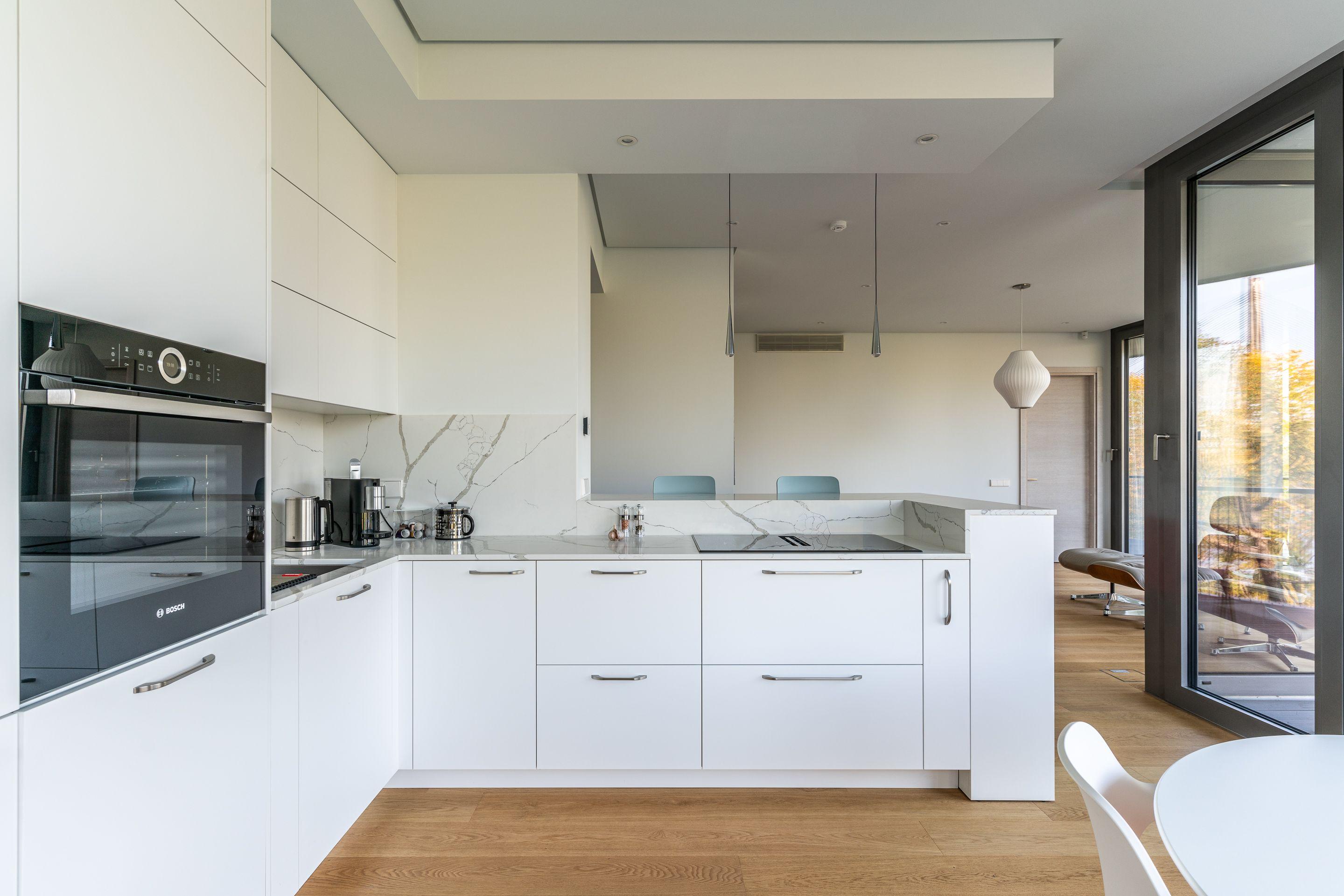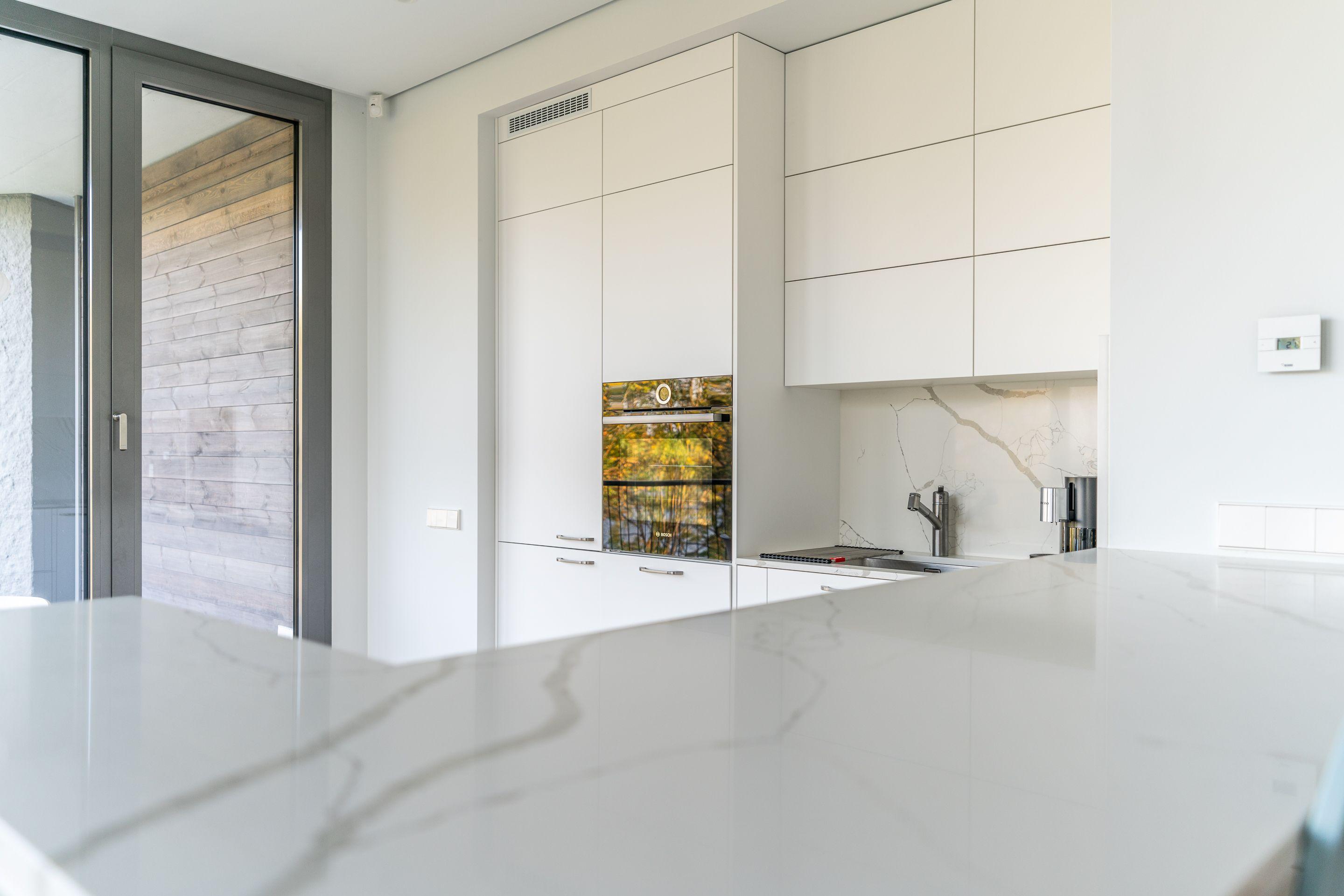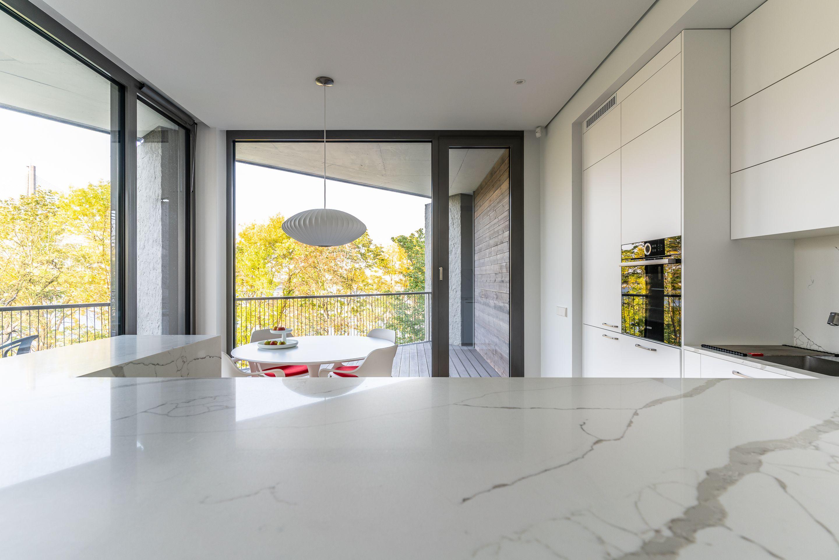 Galerija: bildes no virtuves dzīvoklim pārdaugavā ar Calcatta kvarca akmens darba virsmu