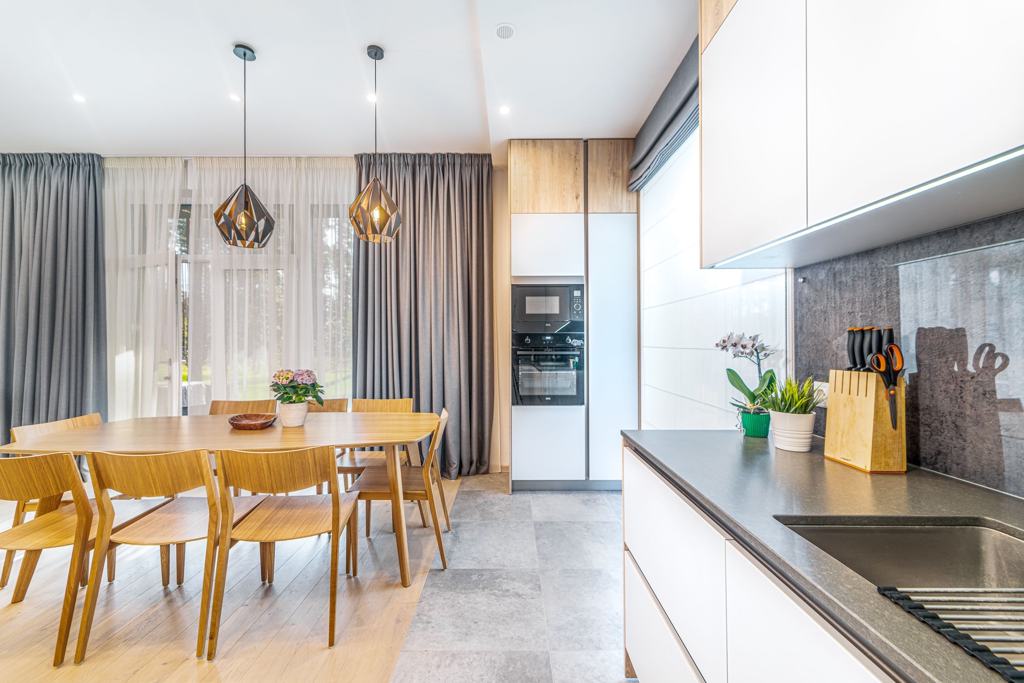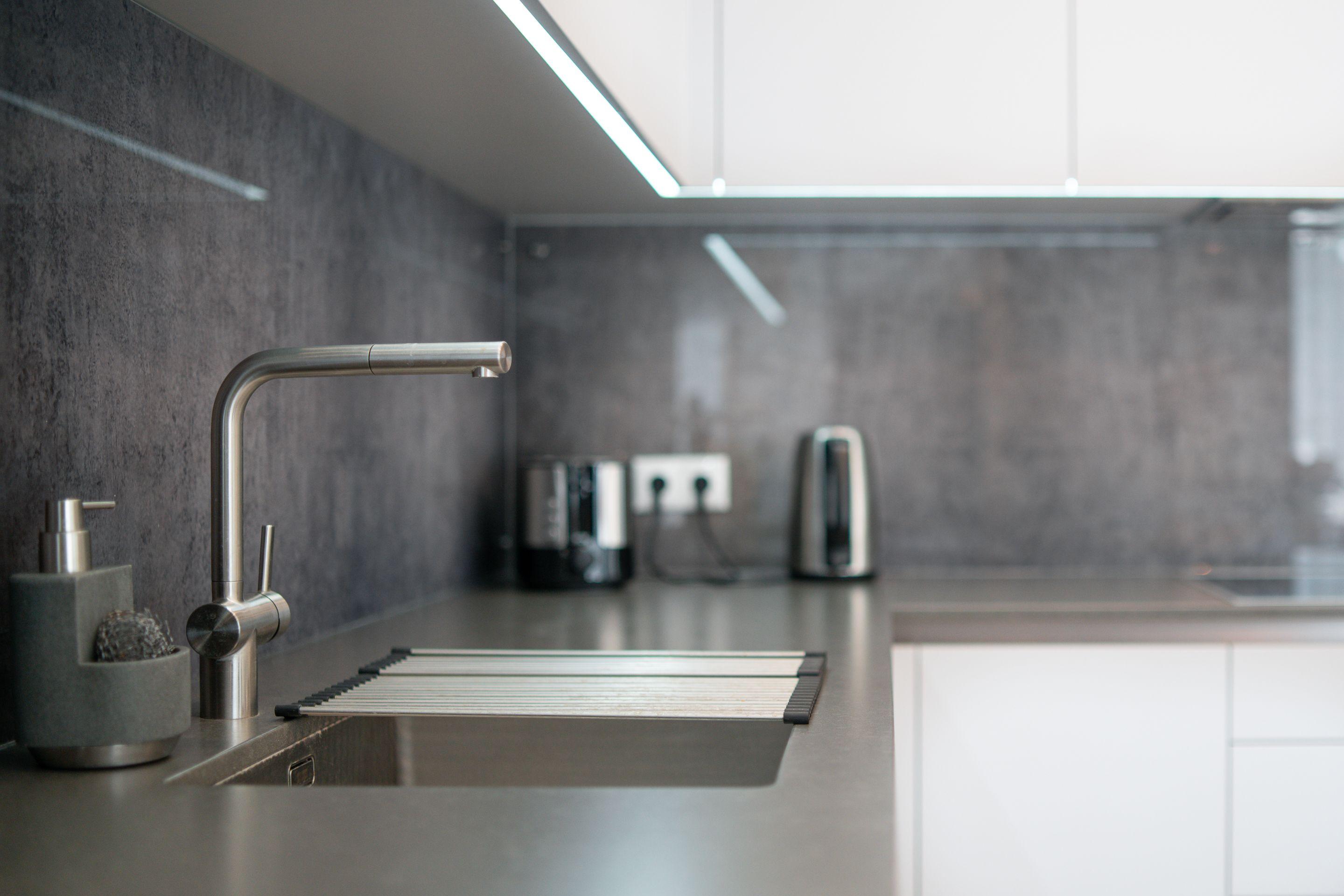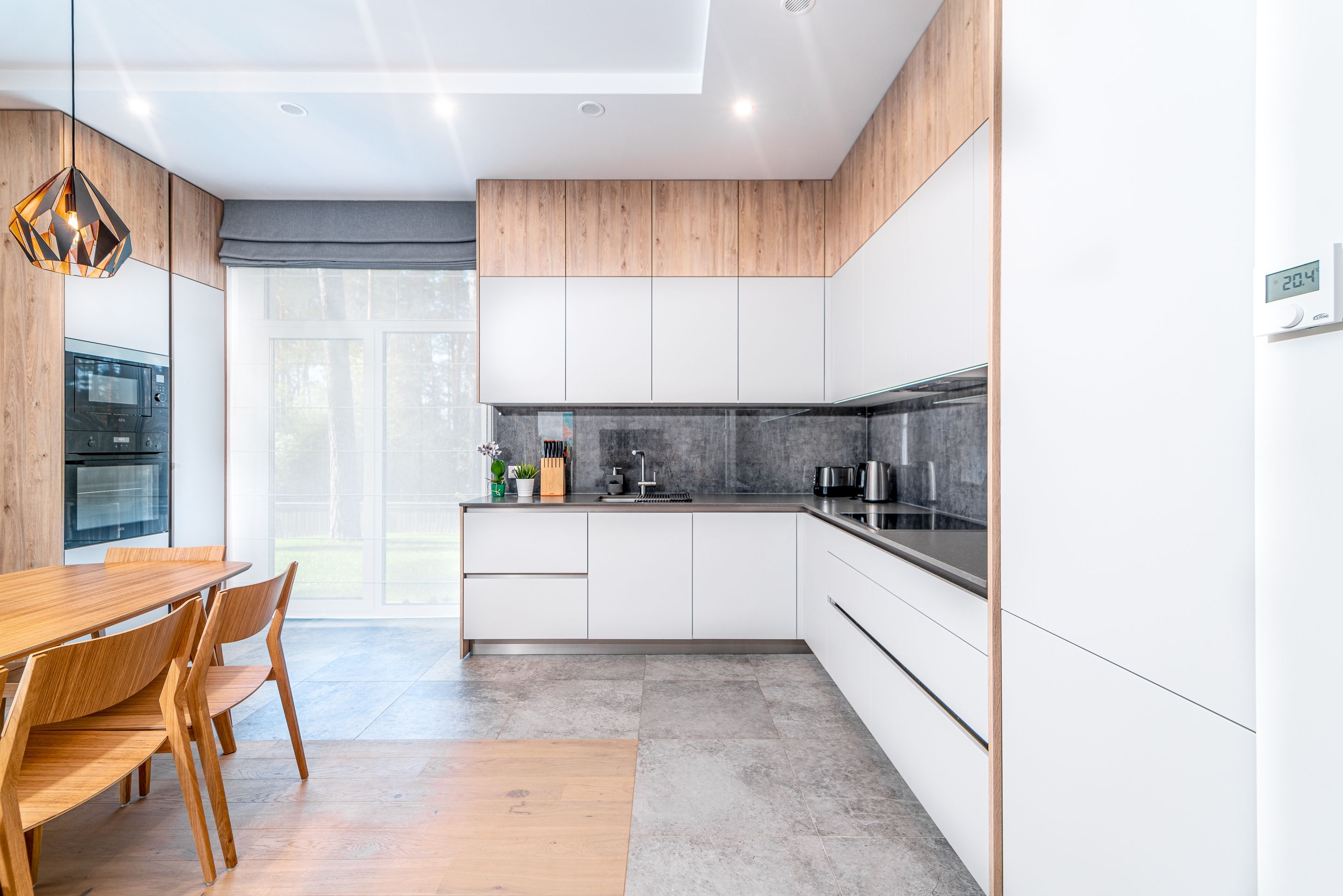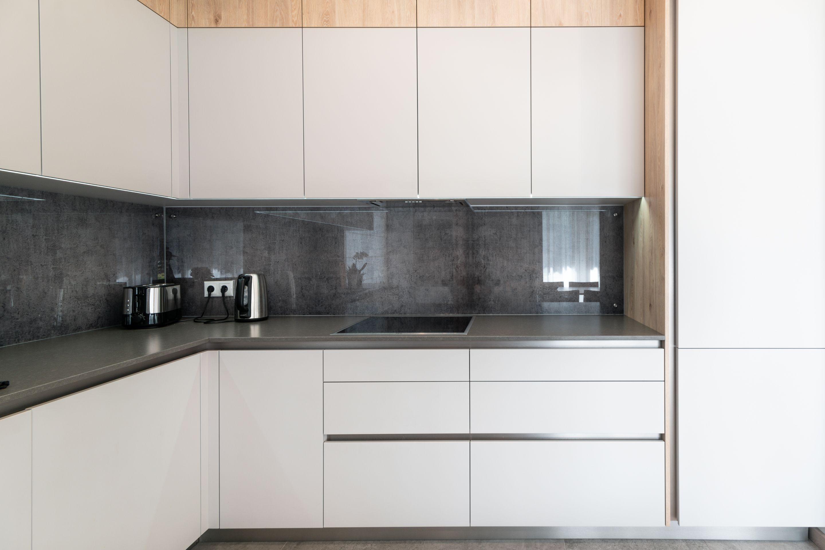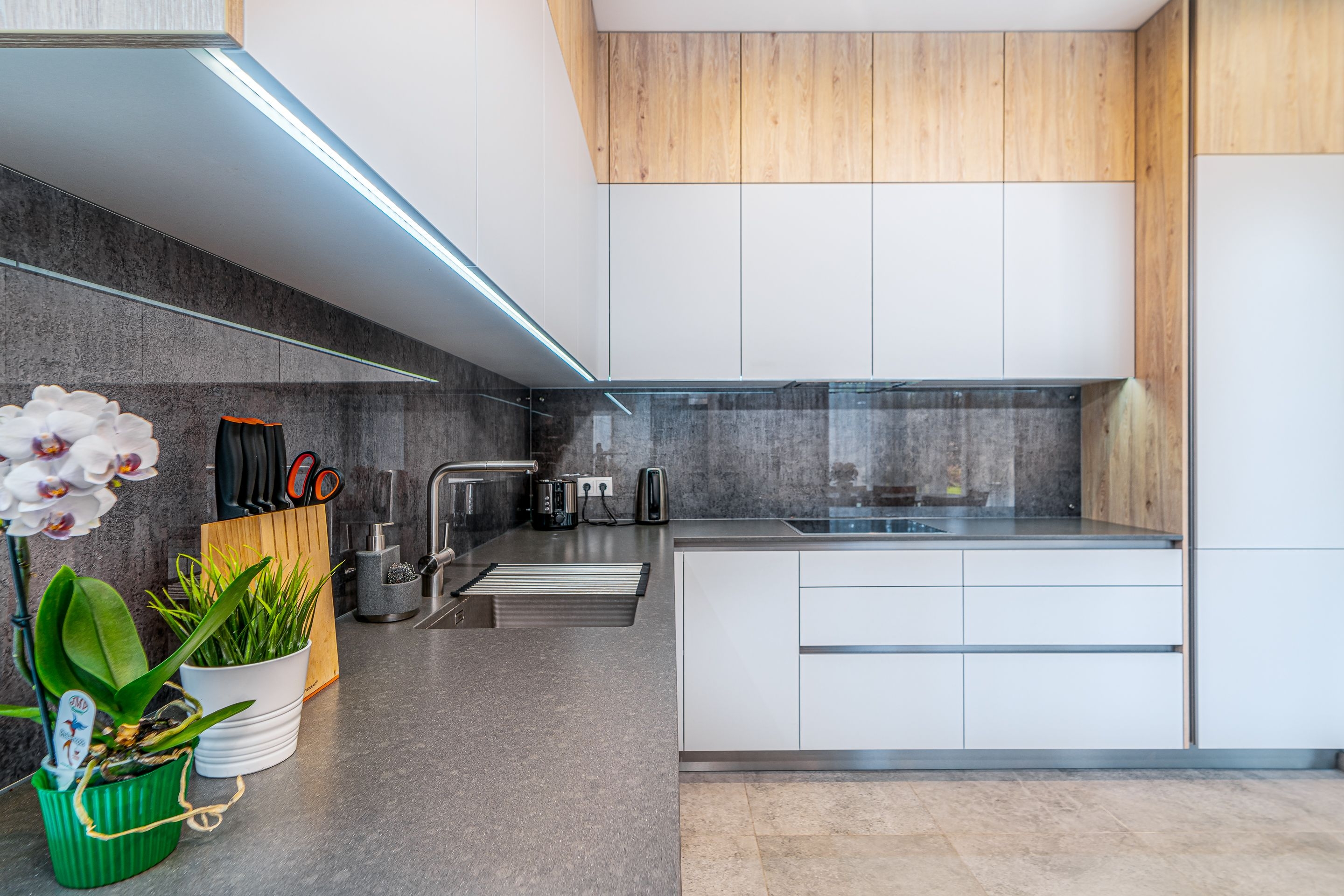 Virtuve ar matēta akrila fasādēm un kvarca akmens darba virsmu