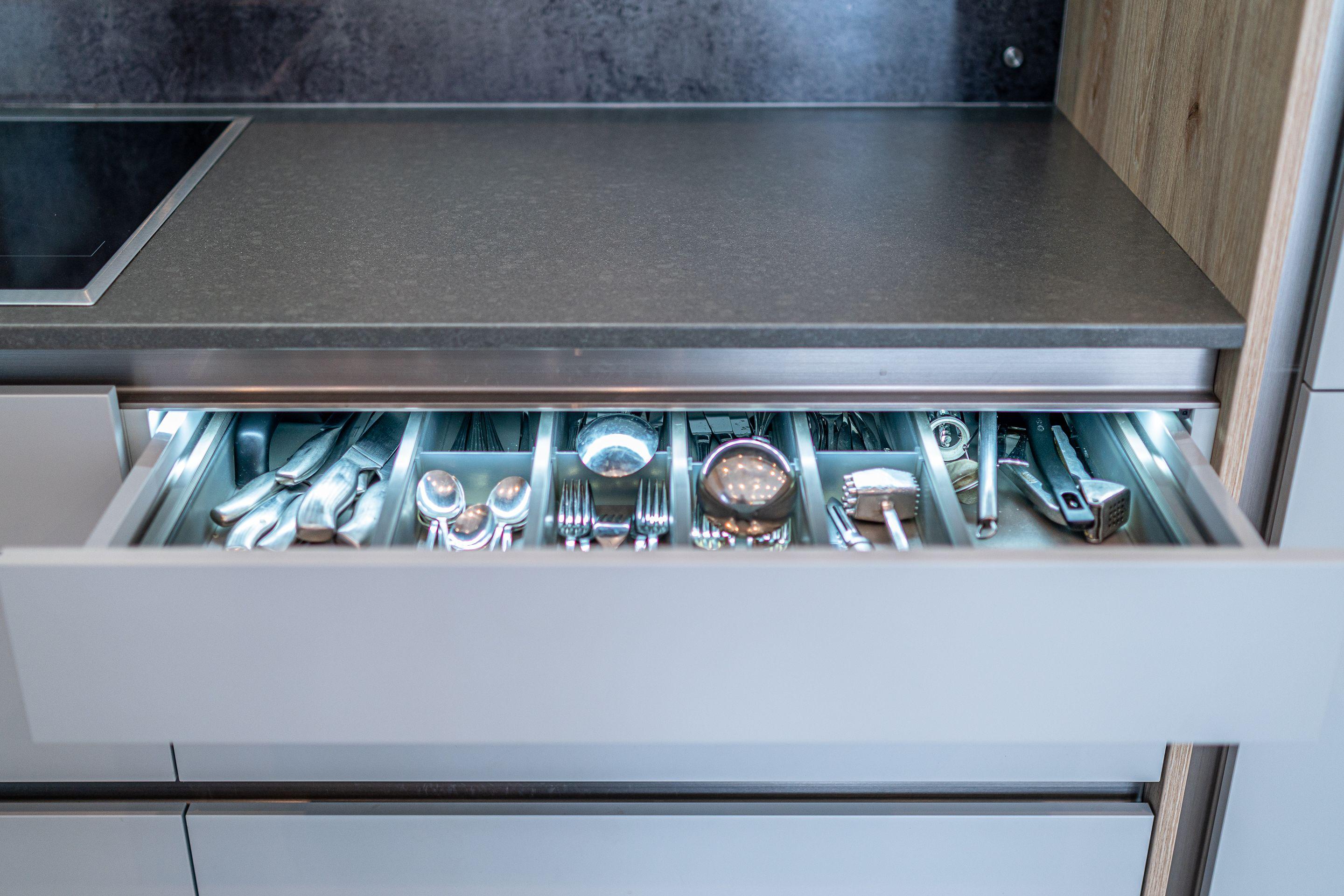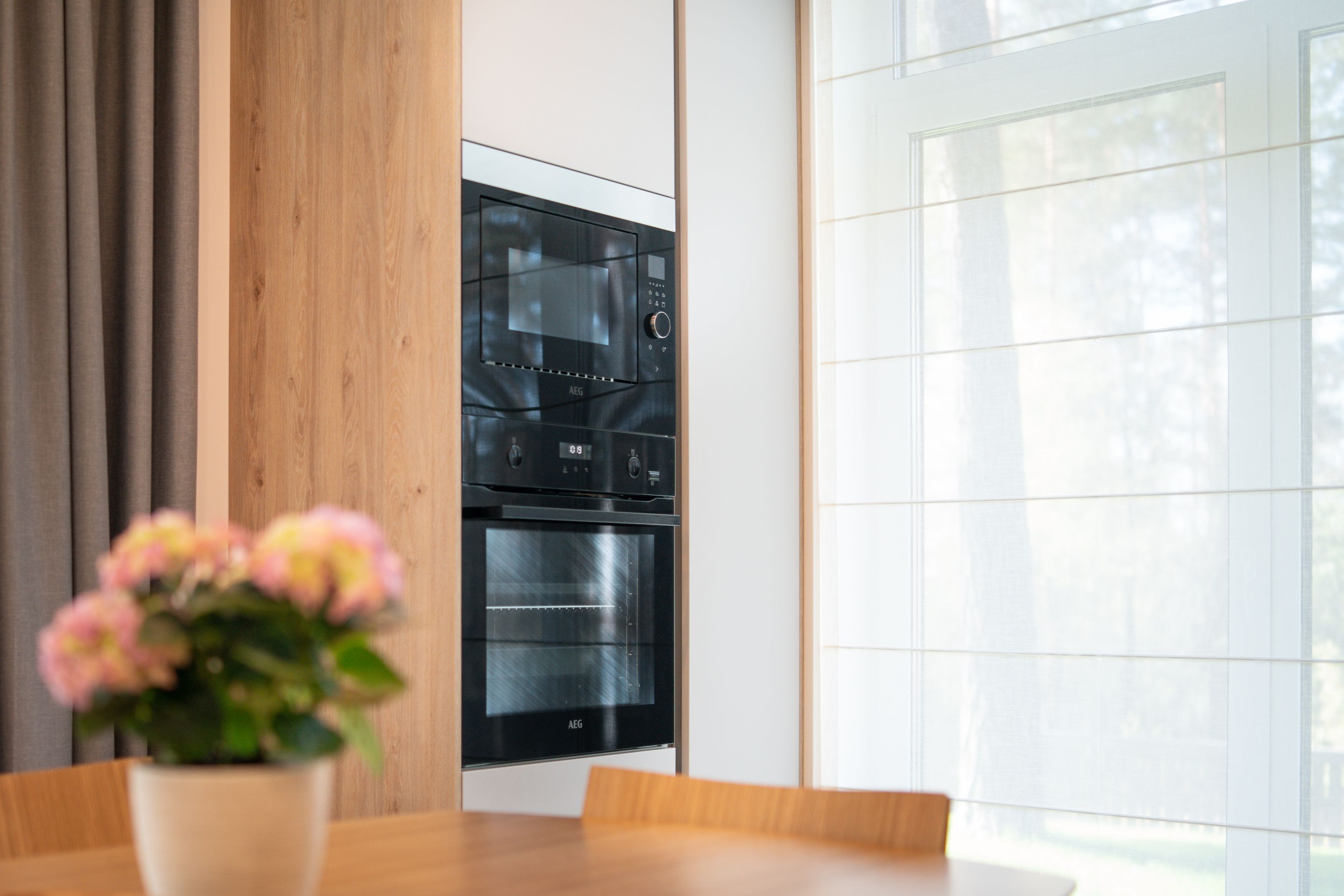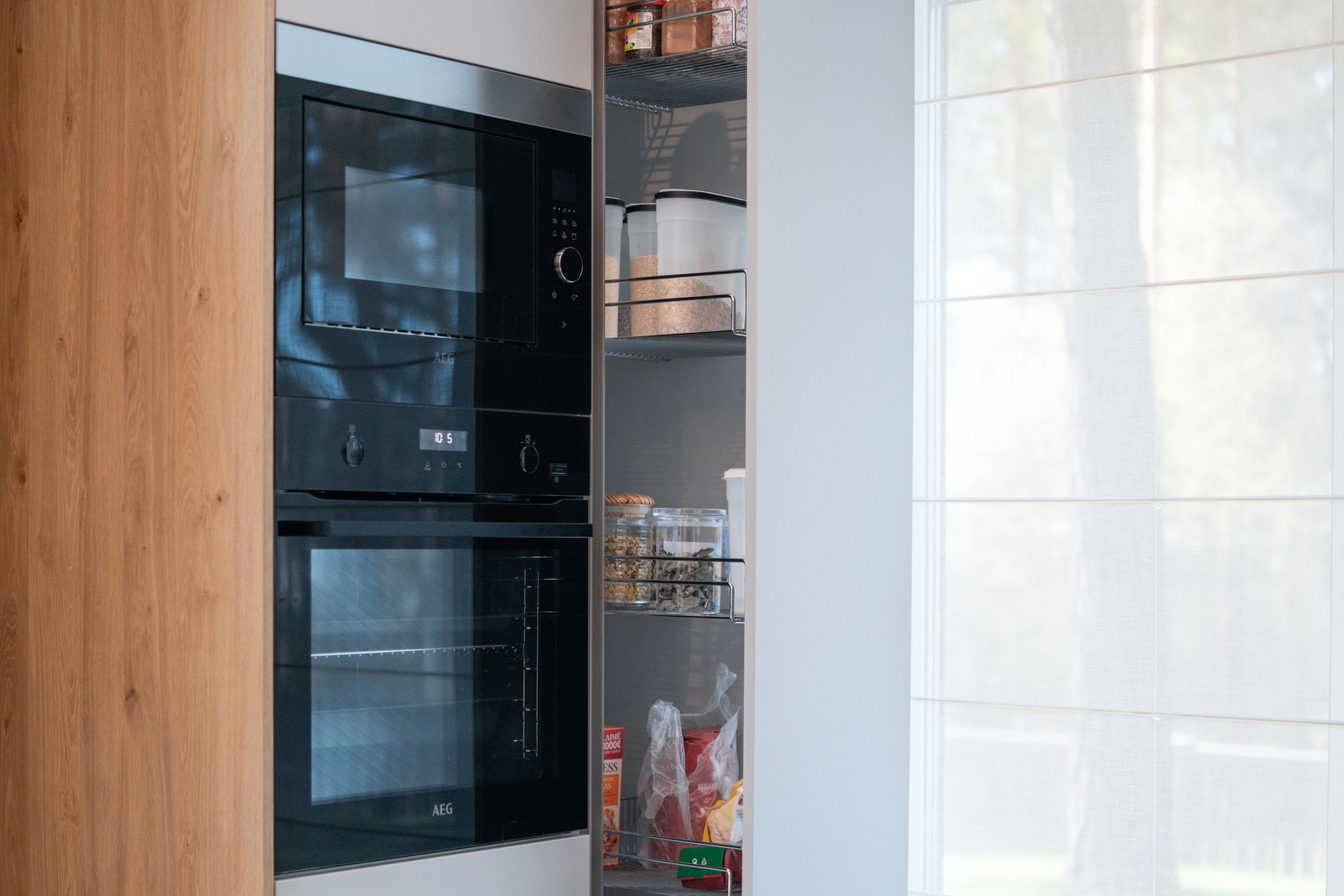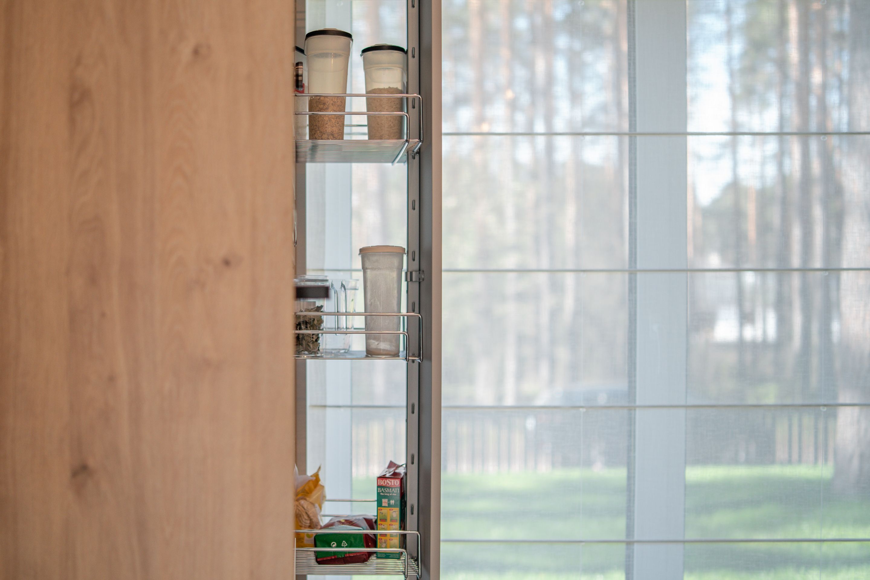 Virtuves mēbeles prīvātmājā Berģos. Fasādes - REHAU matēts akrils, darba virsma - matēta kvarca akmens, stikla sienas panelis ar printu. Komplektācija - BLUM Antaro atvilktņu mehānismi, izvelkamā kolonna, Franke nerūsējošā tērauda pabūvējamā izlietne + Franke ūdens maisītājs, LED darba virsmas apgaismojums.
