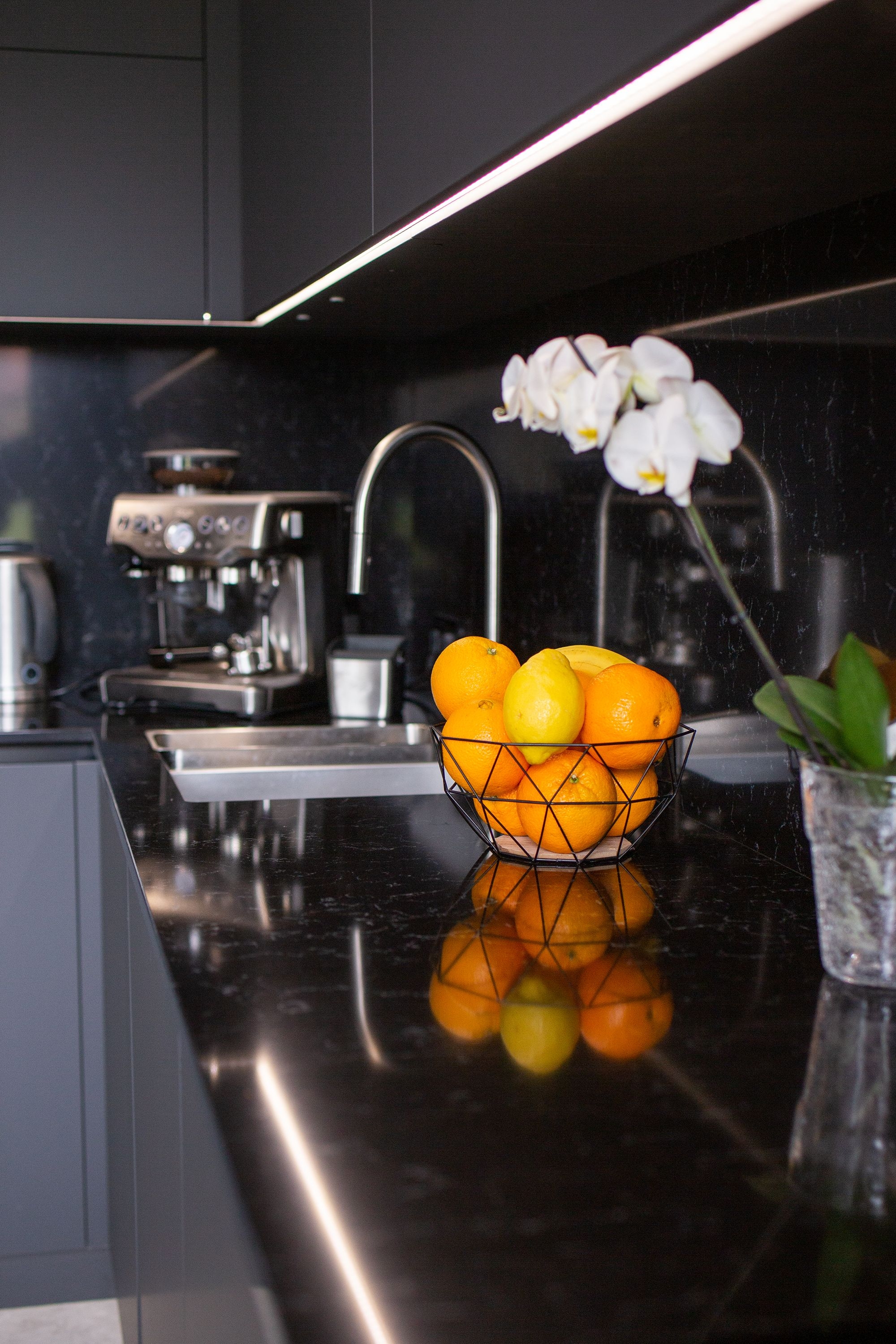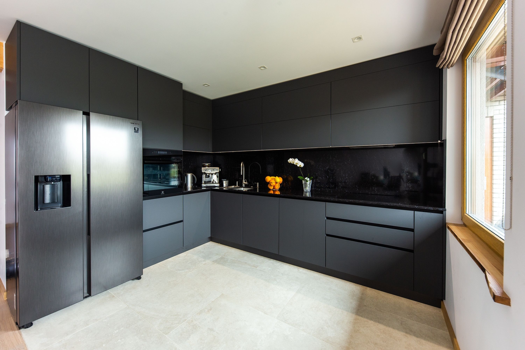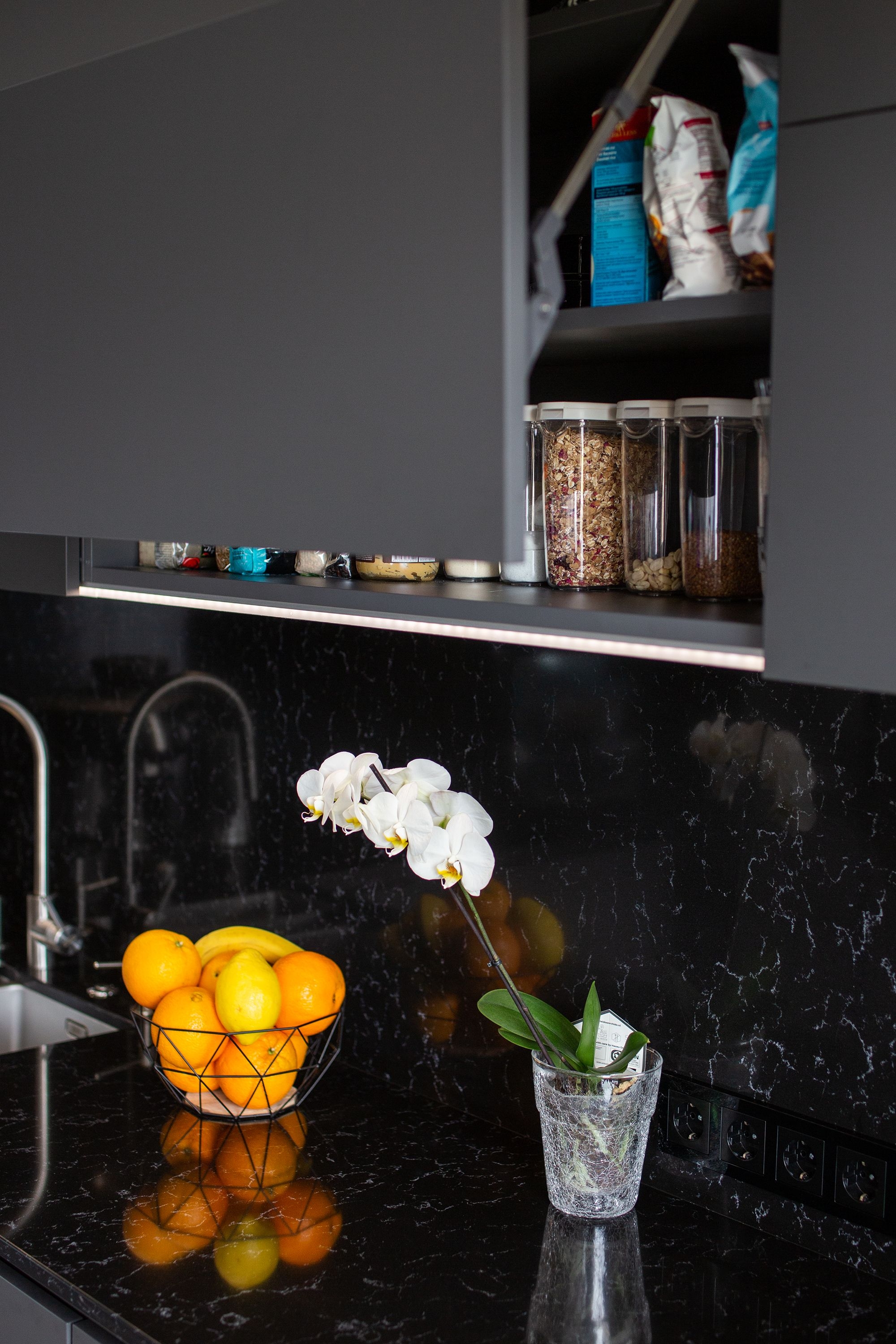 Virtuves mēbeļu projekts ar Egger Perfect Sense fasādēm un kvarca akmens darba virsmu ar sienas paneli. Klientiem svarīgs faktors bija materiālu viegla kopšana un izturība pret mehānisko iedarbību. Sienas skapīšiem bija jābūt ērti lietojamiem, ar ko lieliski tiek galā Blum Aventos mehānismi ar elektrisko Servo pacelšanu. Niša sienā aizpildīta ar Schüco Smart Cube alumīnija plauktu sistēmu, kas atvieglo konstrukciju un pilda dekoratīvo funkciju.