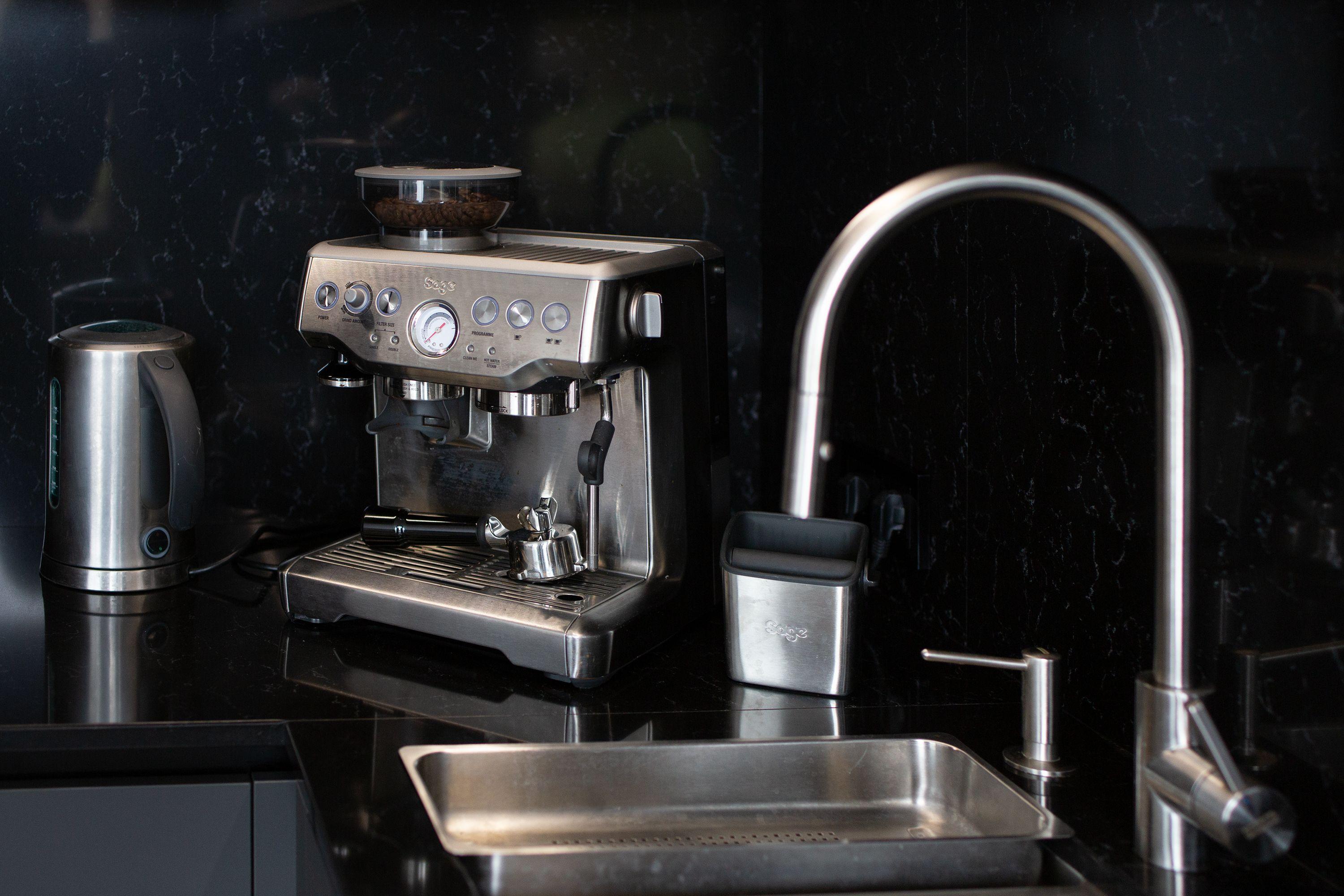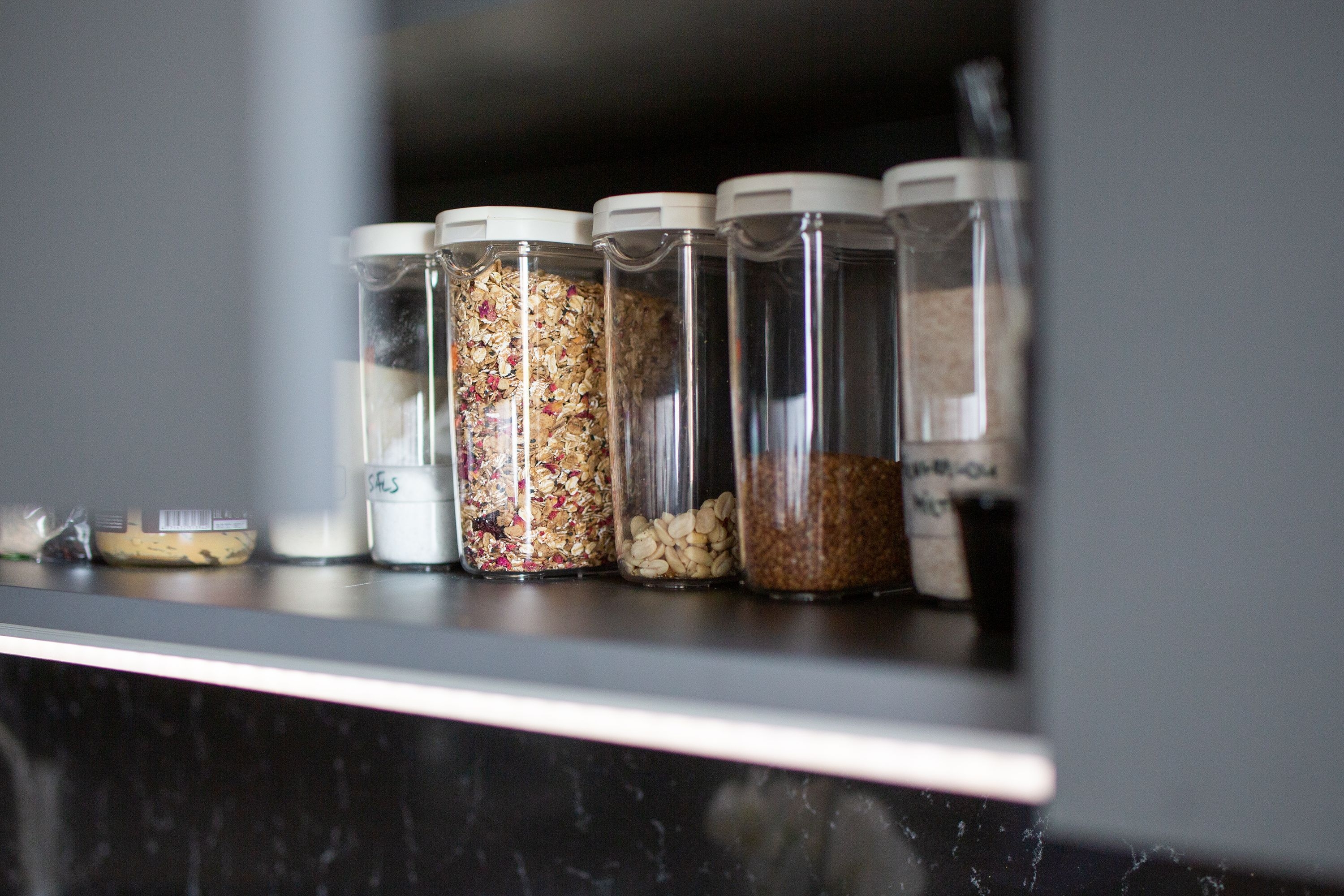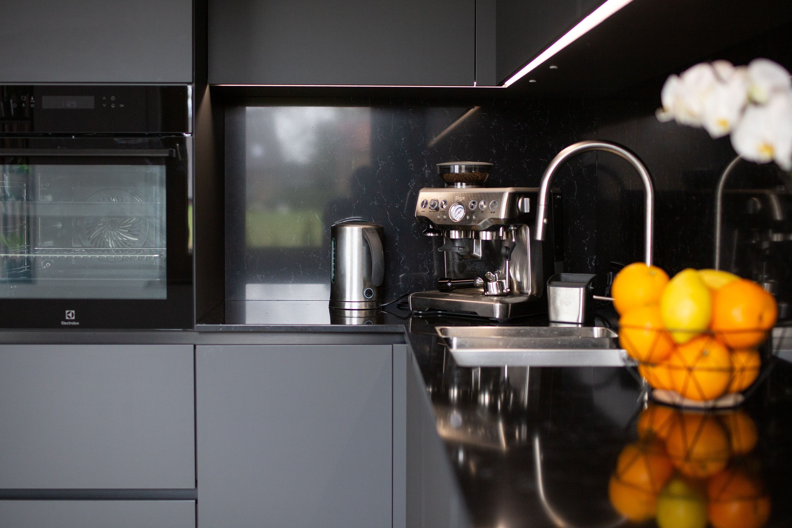Virtuves mēbeļu projekts ar Egger Perfect Sense fasādēm un kvarca akmens darba virsmu ar sienas paneli. Klientiem svarīgs faktors bija materiālu viegla kopšana un izturība pret mehānisko iedarbību. Sienas skapīšiem bija jābūt ērti lietojamiem, ar ko lieliski tiek galā Blum Aventos mehānismi ar elektrisko Servo pacelšanu. Niša sienā aizpildīta ar Schüco Smart Cube alumīnija plauktu sistēmu, kas atvieglo konstrukciju un pilda dekoratīvo funkciju.
