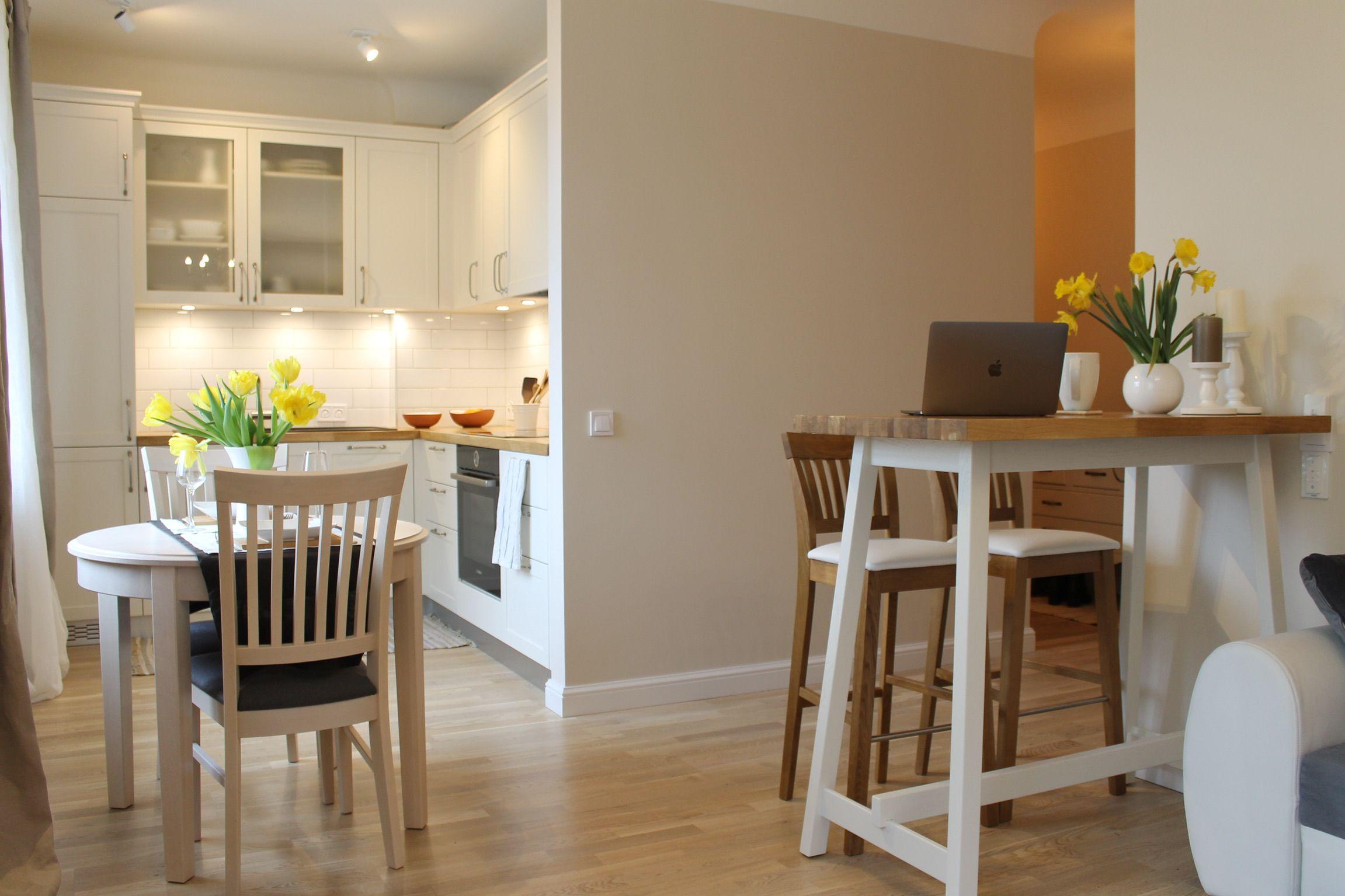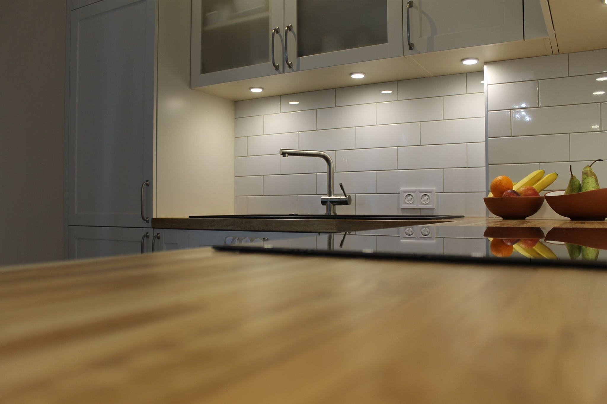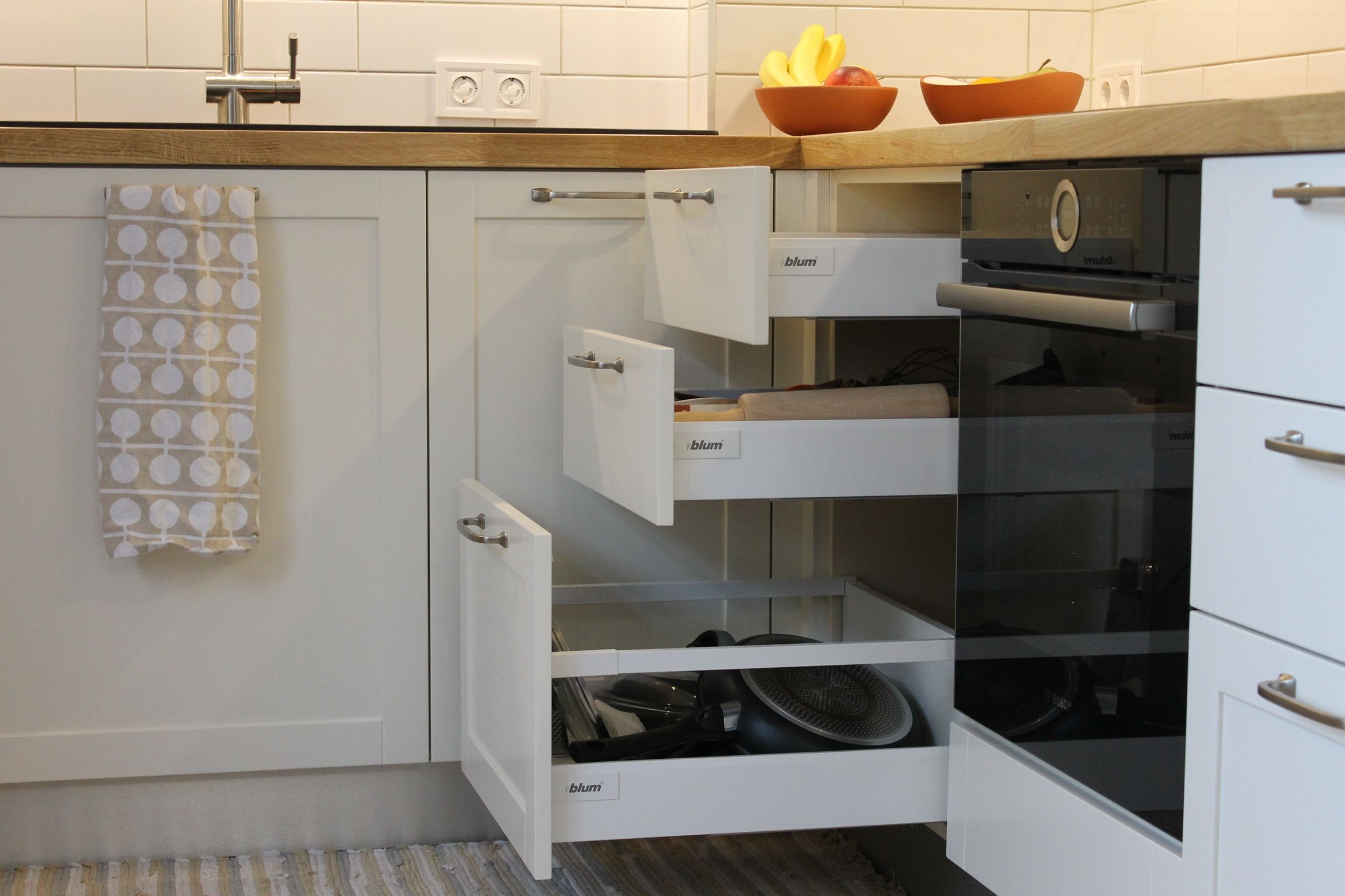 Virtuve ar rāmju krāsotām fasādēm un ozola masīvkoka darba virsmu. BLUM Antaro atvilktņu furnitūra, rokturi Furnipart, Franke Garbo atkritumu šķirošanas sistēma, LED virsmas apgaismojums. Pie virtuves tika izgatavots galdiņs ar krāsotā ozola kājām un masīvkoka eļļotu virsmu.