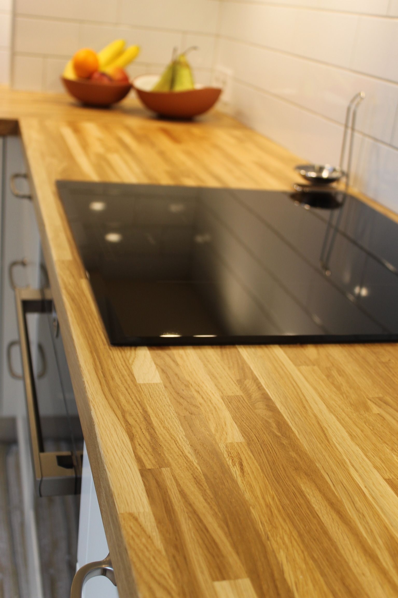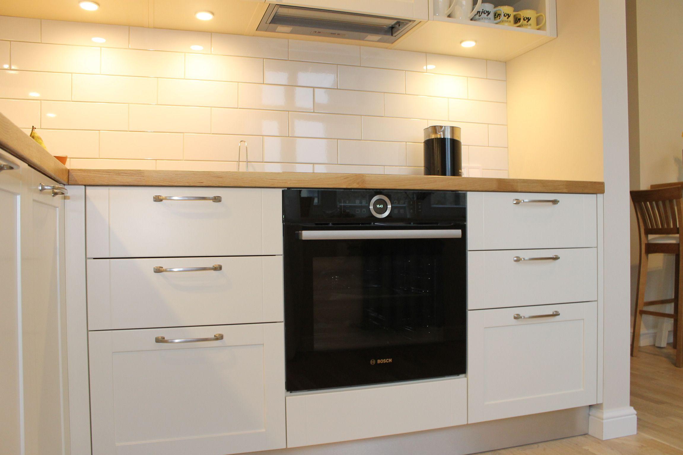 Virtuve ar rāmju krāsotām fasādēm un ozola virsmu