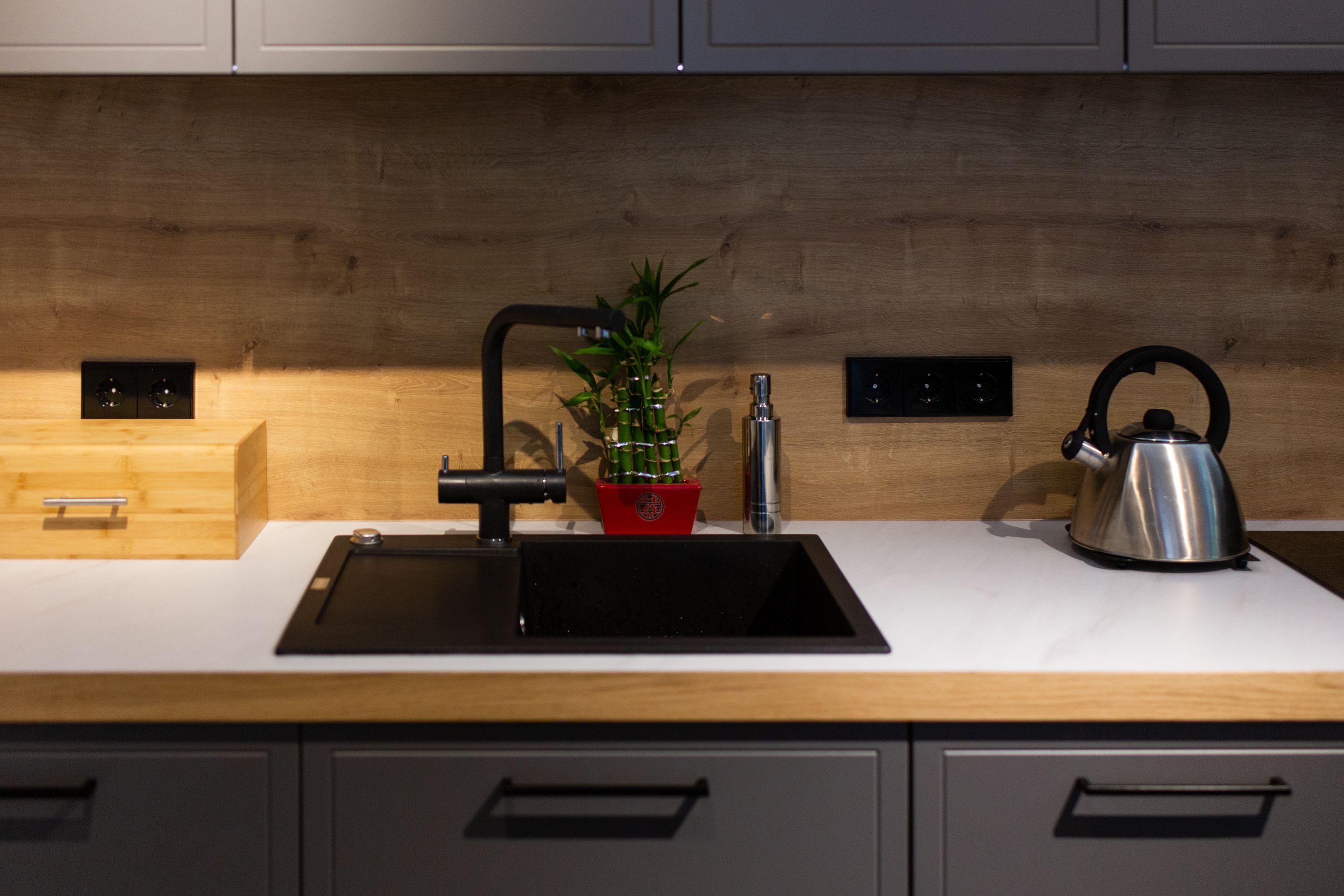 Virtuve privātmājai Rīgā ar krāsota MDF fasādēm, darba virsma - HPL plastikāts ar dabīga ozola malām, sienas panelis - Egger HPL. BLUM Atnaro Orion atvilktņu furnitūra, rokturi - Furnipart.